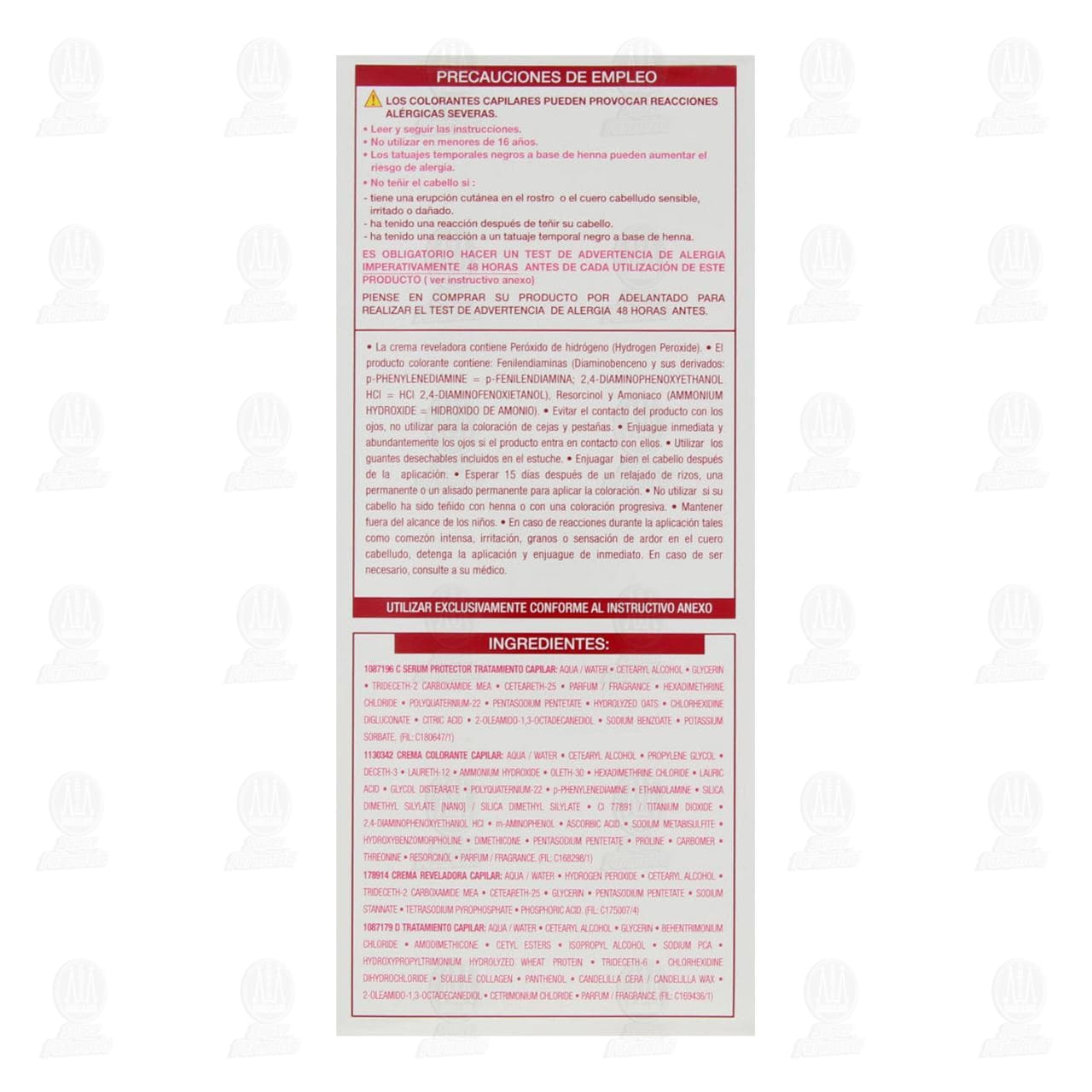 Los colorantes capilares pueden causar reacciones alérgicas severas. Leer y seguir las instrucciones. No utilizar en menores de 16 años. Los tatuajes temporales negros a base de henna pueden aumentar el riesgo de alergia. No teñir el cabello si:1. Tiene una erupción cutánea en el rostro o el cuero cabelludo sensible, irritado o dañado.2. Ha tenido una reacción después de teñir su cabello.3. Ha tenido una reacción a un tatuaje temporal negro a base de Henna. Ignorar una alergia puede ser mortal. Debe realizarse un test de advertencia de alergia 48 horas antes de cada coloración aun si ya ha utilizado antes productos de coloración. Recuerde comprar el producto 48 horas antes. (Lea y siga las instrucciones del folleto). En caso de reacción o cualquier duda consulte a su médico antes de utilizar cualquier producto de coloración. La crema reveladora contiene peróxido de hidrógeno (hydrogen peroxide). El producto colorante contiene: fenilendiaminas [diaminobenceno y sus derivados: p-phenylenediamine = p-fenilendiamina; 2,4-diaminophenoxyethanol HCl = HCl 2,4-diaminofenoxietanol], resorcinol y amoniaco (ammonium hydroxide = hidróxido de amonio). Evitar el contacto del producto con los ojos, no utilizar para la coloración de cejas y pestañas. Enjuague inmediata y abundantemente los ojos si el producto entra en contacto con ellos. Utilizar los guantes desechables incluidos en el estuche. Enjuagar bien el cabello después de la aplicación. Esperar 15 días después de un relajado de rizos, una permanente o un alisado permanente para aplicar la coloración. No utilizar si su cabello ha sido teñido con henna o con una coloración progresiva. Mantener fuera del alcance de los niños. En caso de reacciones durante la aplicación tales como comezón intensa, irritación, granos o sensación de ardor en el cuero cabelludo, detenga la aplicación y enjuague de inmediato. En caso de ser necesario, consulte a su médico.Detalles del producto