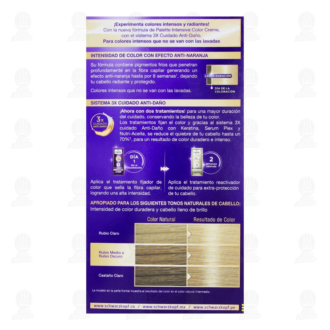 Los colorantes para el cabello pueden causar reacciones alérgicas severas. Lee y sigue las instrucciones. Este producto no está destinado para su uso en personas menores de 16 años. Los tatuajes temporales de "henna negra" pueden aumentar el riesgo de alergia. No utilices el tinte capilar: 1. Si tienes una erupción cutánea en la cara o si tu cuero cabelludo es sensible, irritado o dañado. 2. Si alguna vez has experimentado cualquier tipo de reacción después de la coloración del cabello. 3. Si alguna vez has experimentado una reacción a los tatuajes temporales de "henna negra". Contiene amoniaco (ammonium hydroxide), hidróxido de potasio (potassium hydroxide), peróxido de hidrógeno (hydrogen peroxide). Dependiendo del tono puede contener: diaminotoluenos (phenylendiamines) y resorcina (resorcinol). Revisa la lista completa de ingredientes en la parte inferior del estuche. Este producto puede causar alergia o irritación en algunas personas. Suspende su uso en caso de irritación, si persiste consulta al médico. Evita el contacto con los ojos. En caso de contacto con los ojos, lava inmediata y abundantemente con agua. No aplicar en bigote. No emplear para teñir cejas ni pestañas porque puede causar ceguera y/o daños irreparables. No debe ser aplicado durante el embarazo o cuando se sospeche de su existencia ya que su inocuidad sobre el feto no ha sido comprobada. Enjuaga bien el cabello después de la aplicación. Utiliza los guantes adecuados. Mantén este producto fuera del alcance de los niños. Desecha el sobrante de la mezcla. Lava las manos después de su aplicación.Detalles del producto