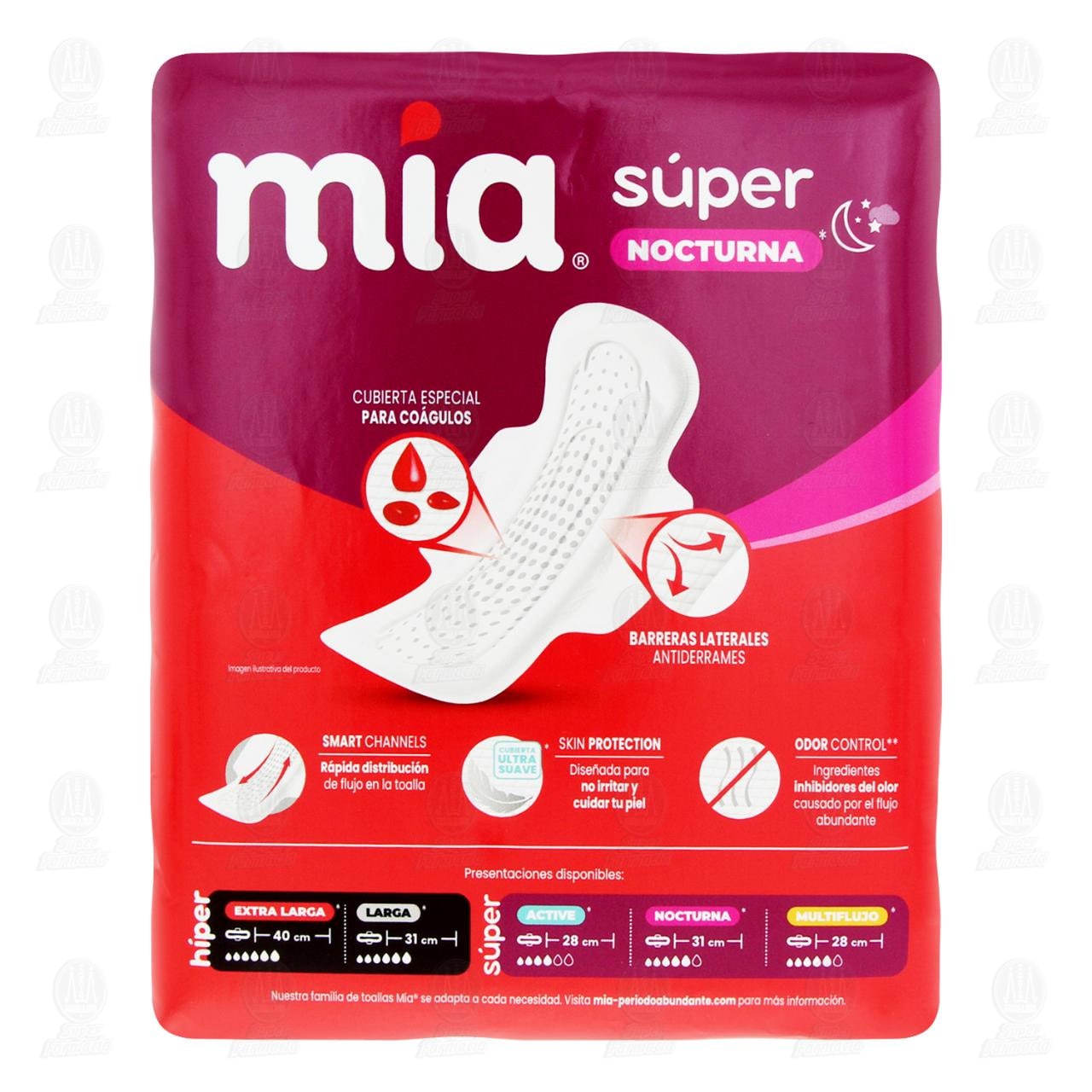 Mía Toalla Femenina súper nocturna para flujo súper abundante, barreras laterales antiderrames y cubierta especial para coágulos que brinda mayor protección durante la noche. Contiene 28 toallas.