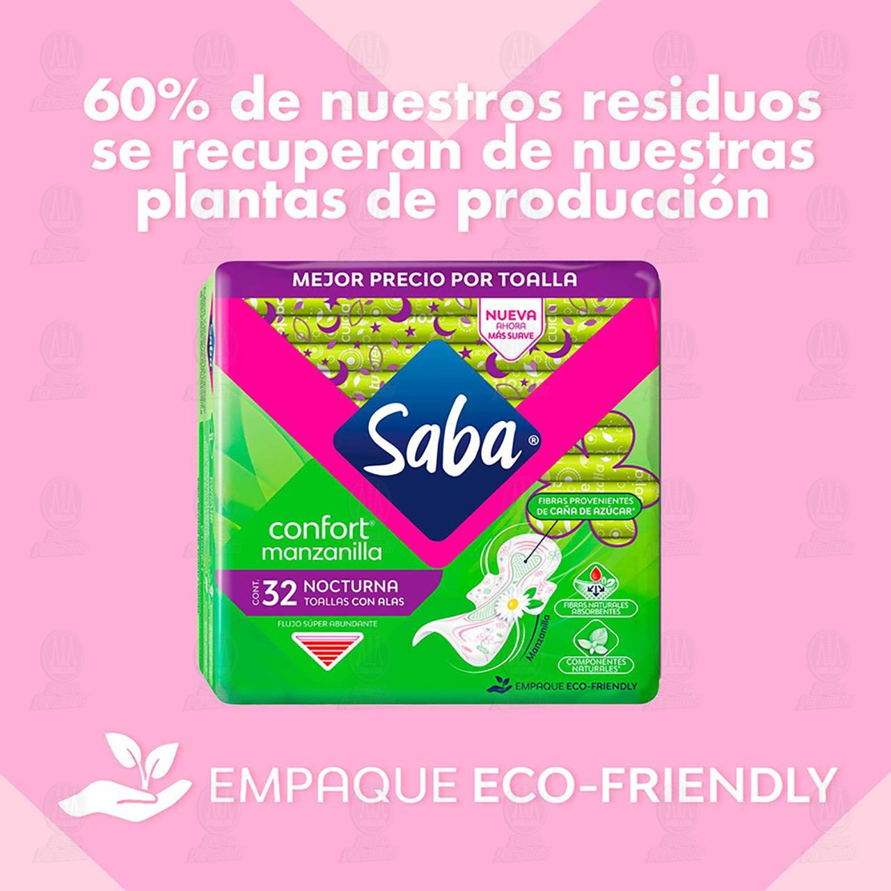 Toallas Femeninas Saba Confort Manzanilla Nocturna con Alas para Flujo Súper Abundante. Paquete con 8 piezas.