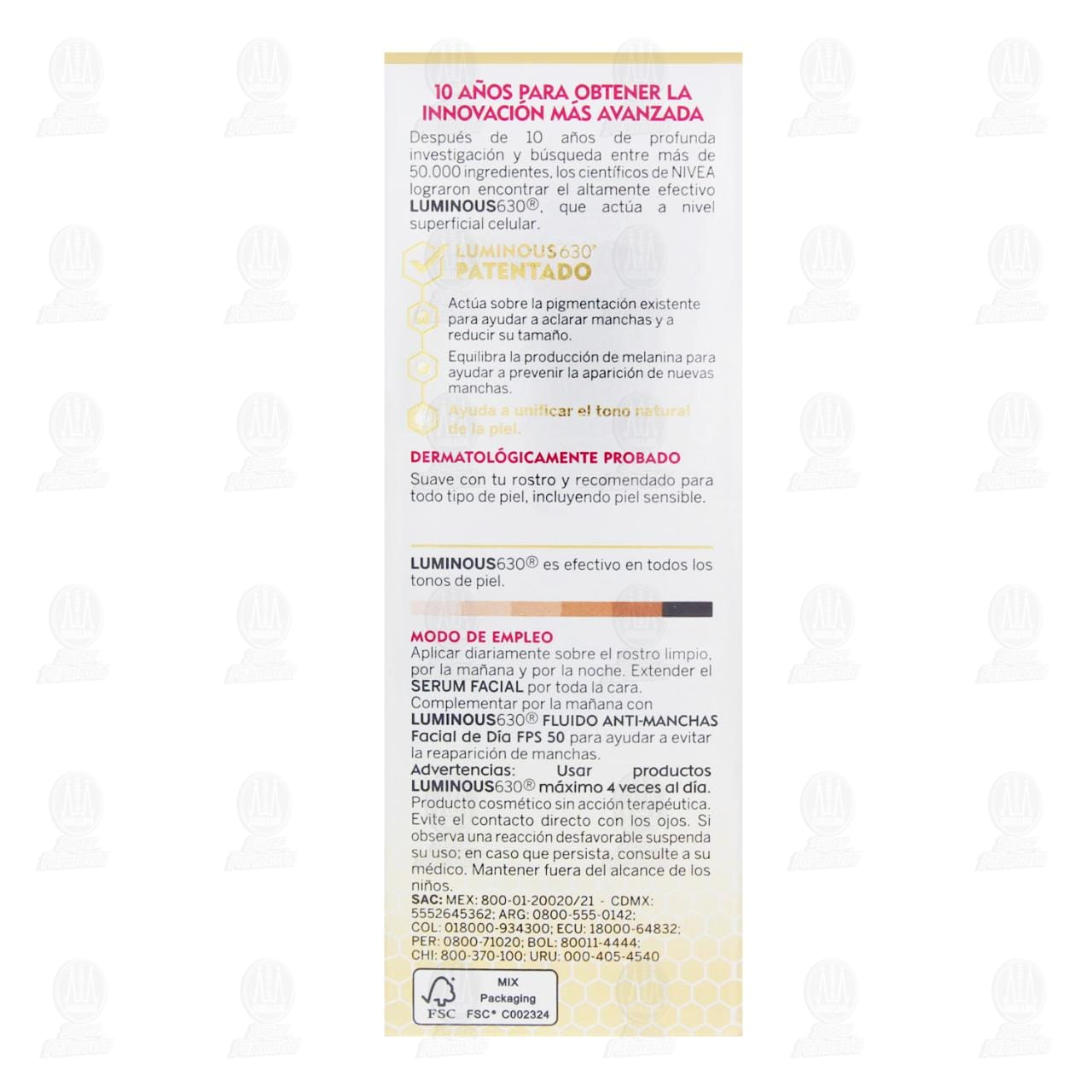 Usar productos Luminous 630 máximo 4 veces al día. Producto cosmético sin acción terapéutica. Evite el contacto directo con los ojos. Si observa una reacción desfavorable suspenda su uso; en caso de que persista, consulte a su médico. Mantener fuera del alcance de los niños.Detalles del producto