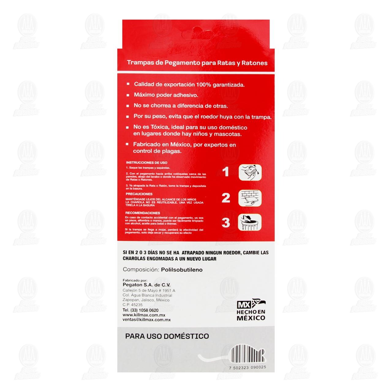 Manténgase lejos del alcance de los niños. La charola no es reutilizable, una vez usada tírela a la basura. Recomendaciones: En caso de contacto accidental con el pegamento, ya sea en pisos, alfombra o manos, puede ser fácilmente limpiado con alcohol, aceite para bebé o thinner. Si la trampa se llega a mojar, perderá la efectividad del pegamento, solo deja secar y recuperará su efecto. Si en 2 o 3 días no se ha atrapado ningún roedor, cambie las charolas engomadas a un nuevo lugar. Para uso doméstico.Detalles del producto