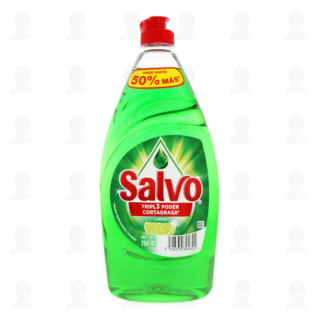 Detergente Líquido Lavatrastes Salvo Limón, Triple Poder Cortagrasa. Envase con 750 mililitros.