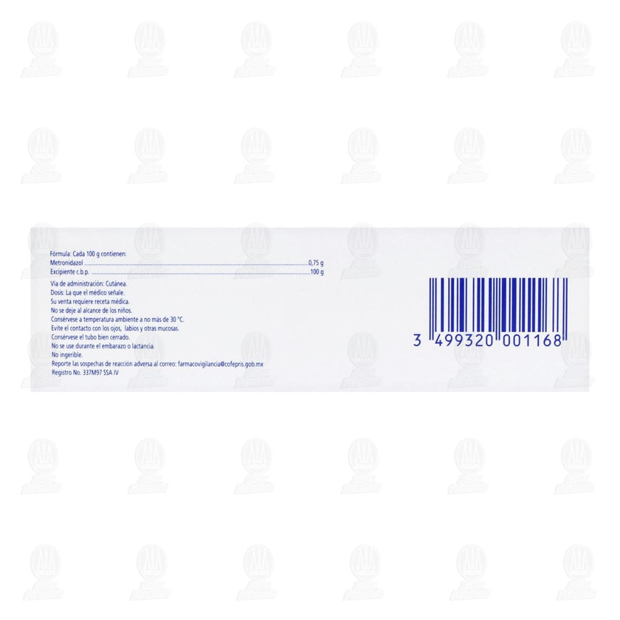 El área de exposición (área bajo la curva [AUC]) a partir de la aplicación de 1 g de metronidazol administrado en forma tópica fue 1.36% de la AUC de una dosis de 250 mg de metronidazol por vía oral (promedio = 912.7 ng•h/ml y aproximadamente 67,207 ng•h/ml, respectivamente).