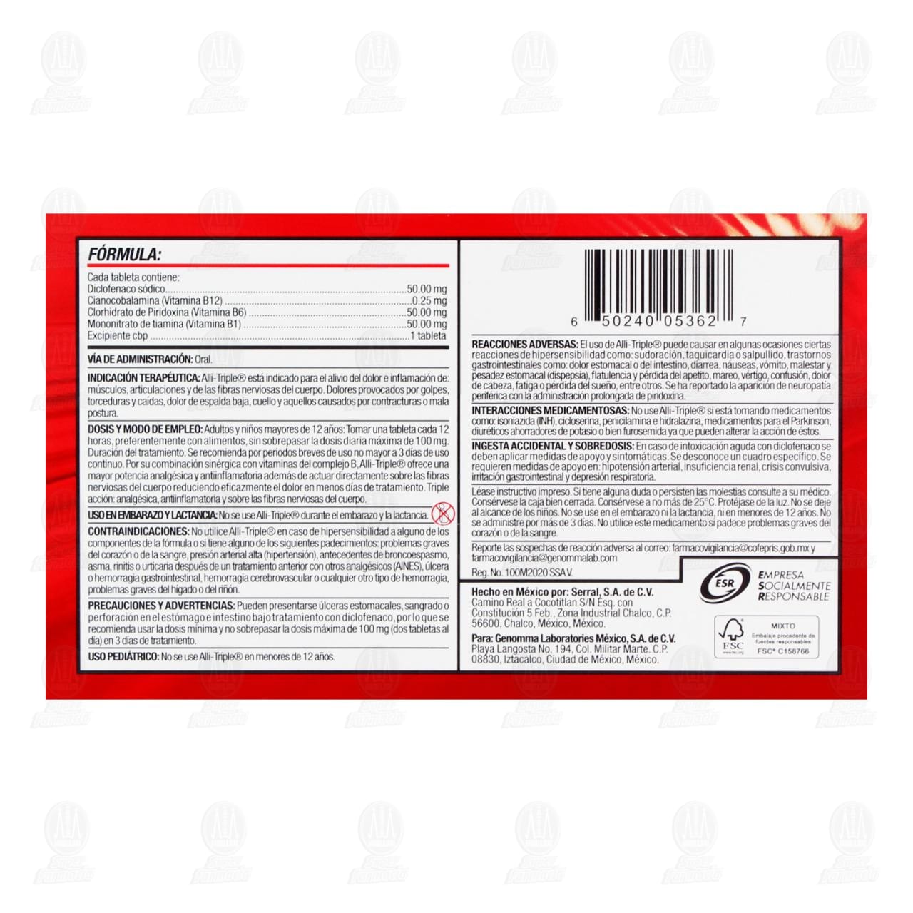 Vía de administración: Oral. Dosis y modo de empleo: Adultos y niños mayores de 12 años: Tomar una tableta cada 12 horas, preferentemente con alimentos, sin sobrepasar la dosis diaria máxima de 100 mg. Duración del tratamiento. Se recomienda por periodos breves de uso no mayor de 3 días de uso continuo. Por su combinación sinérgica con vitaminas del complejo B, Alli-Triple ofrece una mayor potencia analgésica y antiinflamatoria además de actuar directamente sobre las fibras nerviosas del cuerpo reduciendo eficazmente el dolor en menos días de tratamiento. Triple acción analgésica, antiinflamatoria y sobre las fibras del cuerpo. Indicación terapéutica: Alli-triple está indicado para el alivio del dolor e inflamación de: músculos, articulaciones y de las fibras nerviosas del cuerpo. Dolores provocados por golpes, torceduras y caídas, dolor de espalda baja, cuello y aquellos causados por contracturas o mala postura.