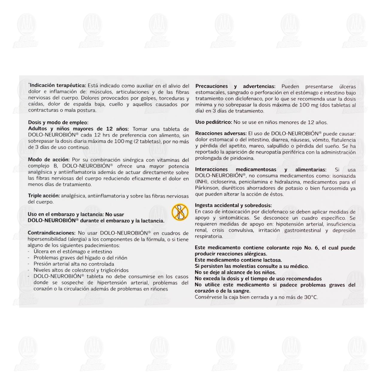 Uso en el embarazo y lactancia: No usar Dolo-Neurobión durante el embarazo y la lactancia. Contraindicaciones: No usar Dolo-Neurobión en cuadros de hipersensibilidad (alergia) a los componentes de la fórmula, o si tiene alguno de los siguientes padecimientos: Úlcera en el estómago e intestino. Problemas graves del hígado o del riñón. Presión arterial alta no controlada. Niveles altos de colesterol y triglicéridos. Dolo-Neurobión tableta no debe consumirse en los casos donde se sospeche de hipertensión arterial, problemas del corazón o la circulación además de problemas en riñones. Precauciones y advertencias: Pueden presentarse úlceras estomacales, sangrado o perforación en el estómago e intestino bajo tratamiento con diclofenaco, por lo que se recomienda usar la dosis mínima y no sobrepasar la dosis máxima de 100 mg (dos tabletas al día) en 3 días de tratamiento. Uso pediátrico: No se use en niños menores de 12 años. Reacciones adversas: El uso de Dolo-Neurobión puede causar: Dolor estomacal o del intestino, diarrea, náuseas vómito, flatulencia y pérdida del apetito, mareo, salpullido o pérdida del sueño. Se ha reportado la aparición de neuropatía periférica con la administración prolongada de piridoxina. Interacciones medicamentosas y alimentarias: Si usa Dolo-Neurobión, no consuma medicamentos como: isoniazida (INH), cicloserina, penicilamina e hidralazina, medicamentos para el párkinson, diuréticos ahorradores de potasio o bien furosemida ya que pueden alterar la acción de éstos. Ingesta accidental y sobredosis: En caso de intoxicación por diclofenaco se deben aplicar medidas de apoyo y sintomáticas. Se desconoce un cuadro específico. Se requieren medidas de apoyo en: hipotensión arterial, insuficiencia renal, crisis convulsiva, irritación gastrointestinal y depresión respiratoria. Este medicamento contiene colorante rojo no.6, el cual puede producir reacciones alérgicas. Este medicamento contiene lactosa.Detalles del producto