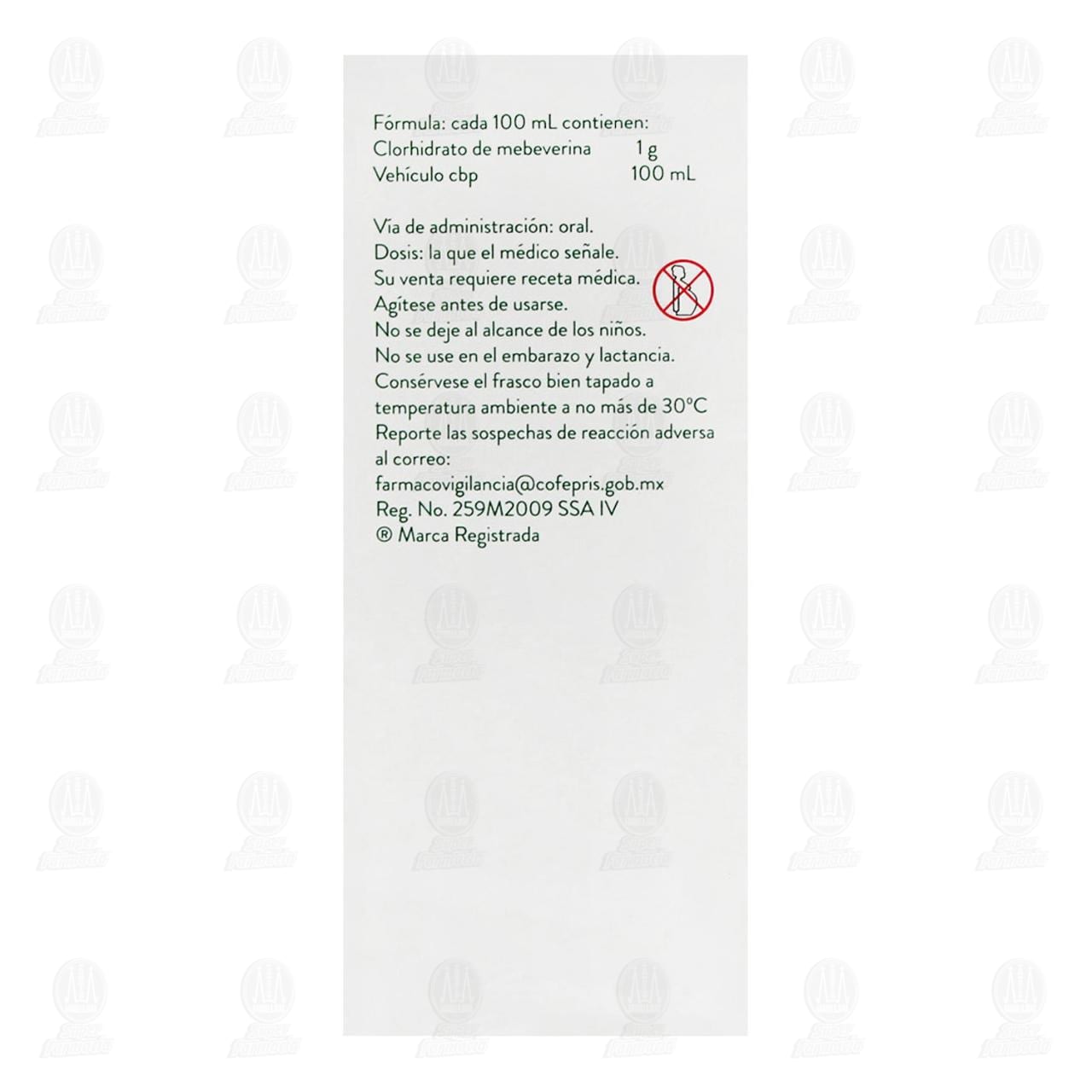 FARMACOCINÉTICA Y FARMACODINAMIA: El clorhidrato de mebeverina es un derivado metoxibenzamínico con actividad antiespasmódica de acción directa sobre toda la musculatura lisa, actúa aliviando el espasmo y regulando la motilidad colónica. Se ha observado una importante reducción de la actividad colónica alterada de hasta un 53% en aquellos pacientes con síndrome de intestino irritable a los cuales se les administraron dosis orales de mebeverina entre 100 y 200 mg. En niños menores de 10 años se calcula la dosis a razón de 3 mL por 5 kg de peso.