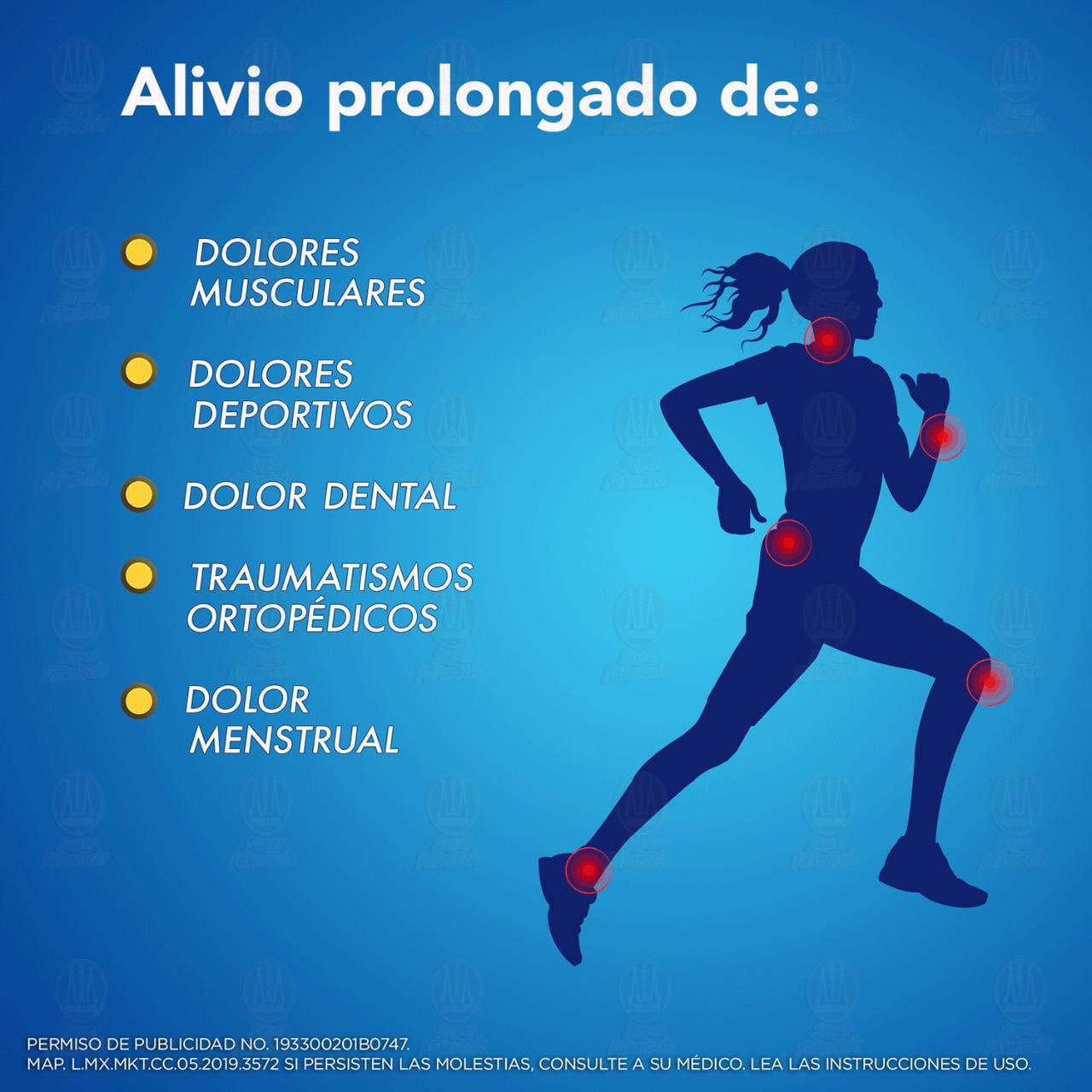Siente el alivio del dolor y la inflamación. Antiinflamatorio con efecto analgésico que ayuda a eliminar el dolor muscular, de espalda, cuello, piernas y hombros a causa de golpes, torceduras, esguinces y mala postura (Naproxeno)
