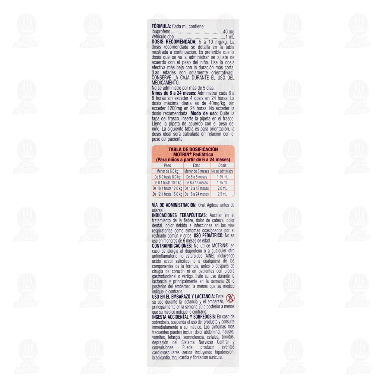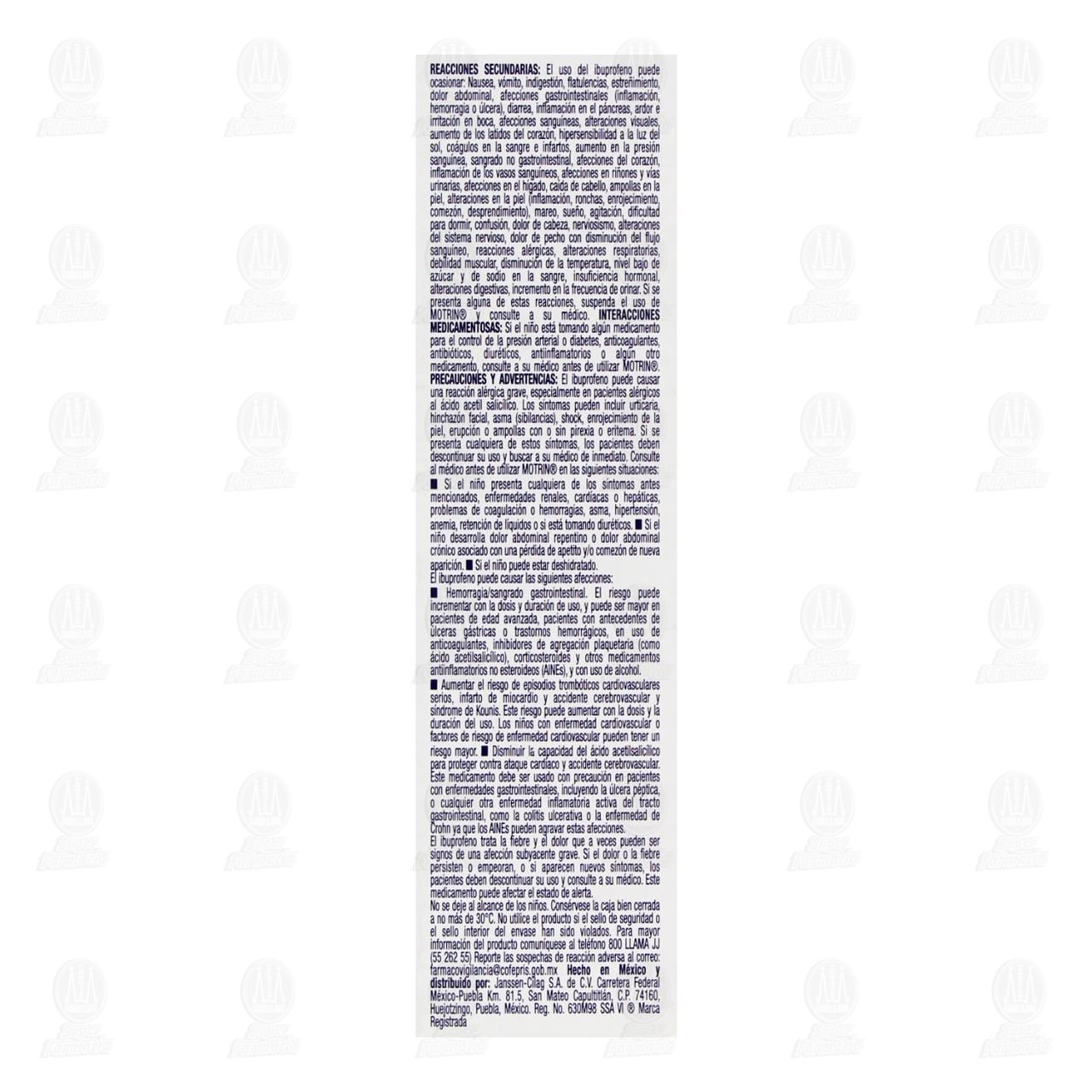 Uso pediatrico: No se use en menores de 6 meses de edad. Contraindicaciones: No utilice motrin en caso de alergia al ibuprofeno o a cualquier otro antiinflamatorio no esteroideo (AINE), incluyendo ácido acetil salicílico, o a cualquiera de los componentes de la fórmula, antes o después de cirugía de corazón ni en pacientes con úlcera gastroduodenal o vértigo. Uso en el embarazo y lactancia: Evite su uso durante la lactancia y el embarazo, principalmente en la semana 20 o posterior a menos que su médico indique lo contrario. Ingesta accidental y sobredosis: En caso de sobredosis, suspenda el uso del producto y consulte inmediatamente a su médico. Los síntomas más frecuentes pueden incluir: dolor abdominal, náusea, vómitos, letargia, somnolencia, cefalea, tinnitus, depresión del Sistema Nervioso Central y convulsiones. Puede producir eventos cardiovasculares serios incluyendo hipotensión, bradicardia, taquicardia y fibrilación auricular. Precauciones y advertencias: El ibuprofeno puede causar una reacción alérgica grave, especialmente en pacientes alérgicos al ácido acetil salicílico. Los síntomas pueden incluir urticaria, hinchazón facial, asma (sibilancias), shock, enrojecimiento de la piel, erupción o ampollas con o sin pirexia o eritema. Si se presenta cualquiera de estos síntomas, los pacientes deben descontinuar su uso y buscar a su médico de inmediato. Consulte al médico antes de utilizar motrin en las siguientes situaciones: Si el niño presenta cualquiera de los síntomas antes mencionados, enfermedades renales, cardiacas o hepáticas, problemas de coagulación o hemorragias, asma, hipertensión, anemia, retención de líquidos o si está tomando diuréticos. Si el niño desarrolla dolor abdominal repentino o dolor abdominal crónico asociado con una pérdida de apetito y/o comezón de nueva aparición. Si el niño puede estar deshidratado. El ibuprofeno puede causar las siguientes afecciones: Hemorragia/sangrado gastrointestinal. El riesgo puede incrementar con la dosis y duración de uso, y puede ser mayor en pacientes de edad avanzada, pacientes con antecedentes de ulceras gástricas o trastornos hemorrágicos, en uso de anticoagulantes, inhibidores de agregación plaquetaria (como ácido acetilsalicílico), corticosteroides y otros medicamentos antiinflamatorios no esteroideos (AINEs), y con uso de alcohol. Aumentar el riesgo de episodios trombóticos cardiovasculares serios, infarto de miocardio y accidente cerebrovascular y síndrome de Kounis. Este riesgo puede aumentar con la dosis y la duración del uso. Los niños con enfermedad cardiovascular o factores de riesgo de enfermedad cardiovascular pueden tener un riesgo mayor. Disminuir la capacidad del ácido acetilsalicílico para proteger contra ataque cardíaco y accidente cerebrovascular. Este medicamento debe ser usado con precaución en pacientes con enfermedades gastrointestinales, incluyendo la ulcera péptica, o cualquier otra enfermedad inflamatoria activa del tracto gastrointestinal, como la colitis ulcerativa o la enfermedad de Crohn ya que los AINEs pueden agravar estas afecciones. El ibuprofeno trata la fiebre y el dolor que a veces pueden ser signos de una afección subyacente grave. Si el dolor o la fiebre persisten o empeoran, o si aparecen nuevos síntomas, los pacientes deben descontinuar su uso y consultar a su médico. Este medicamento puede afectar el estado de alerta. No se deje al alcance de los niños. Consérvese la caja bien cerrada a no más de 30°C. No utilice el producto si el sello de seguridad o el sello interior del envase han sido violados.Detalles del producto
