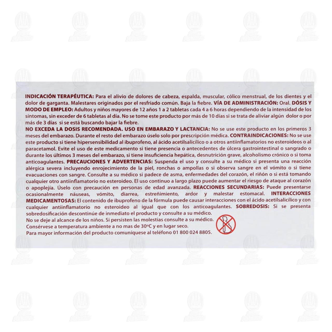 Indicación terapéutica: Para el alivio de los dolores de cabeza, espalda, muscular, cólico menstrual, de los dientes y el dolo de garganta. Malestares originados por el resfriado común. Baja la fiebre. Vía de administración: Oral. Dosis y modo de empleo: Adulto y niños mayores de 12 años 1 a 2 tabletas cada 4 a 6 horas dependiendo de la intensidad de los síntomas, sin exceder de 6 tabletas al día. No se tome este producto por más de 10 días si se trata de aliviar algún dolor o por más de 3 días si se está buscando de bajar la fiebre.