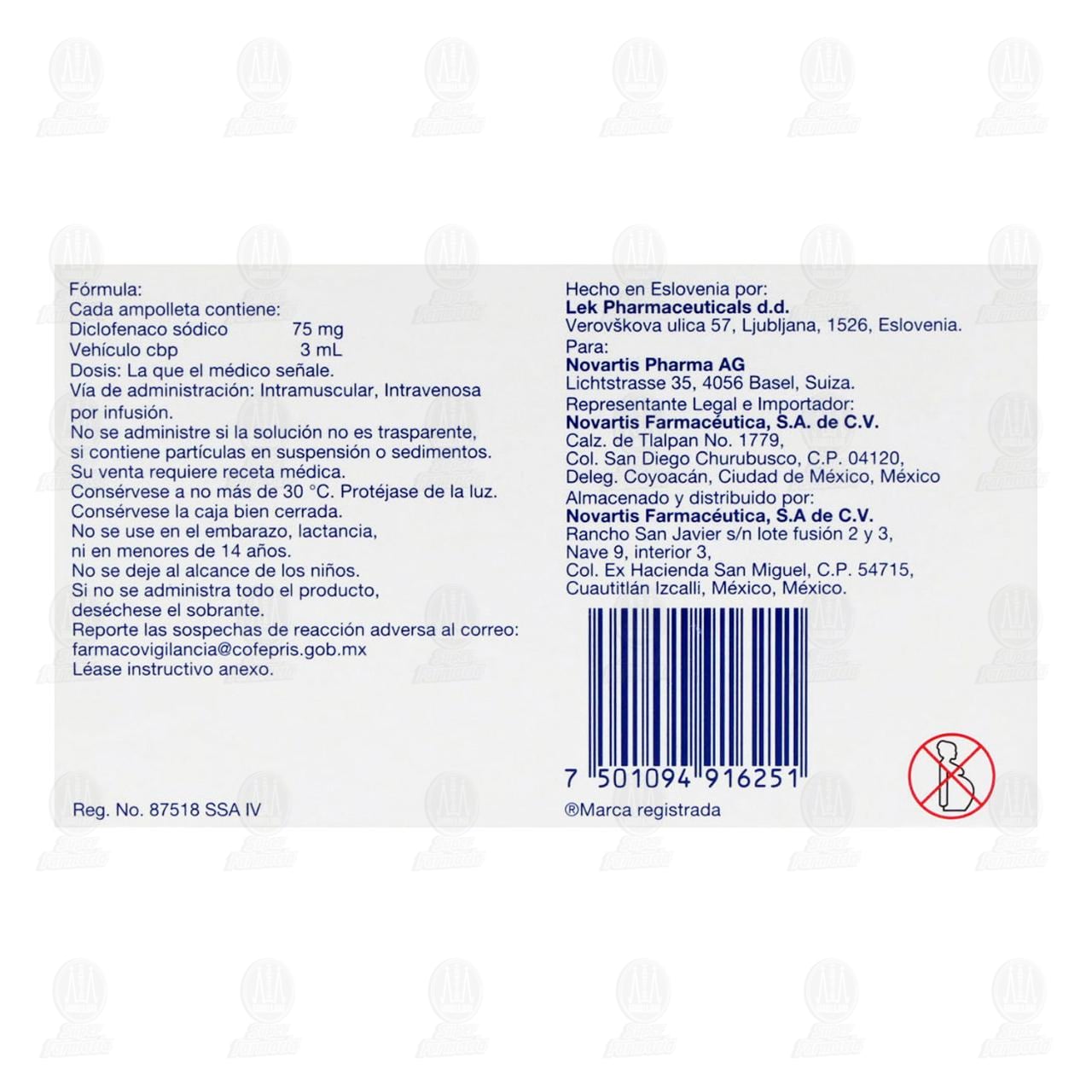 Su venta requiere receta médica. No se deje al alcance de los niños. El uso del medicamento durante los 2 primeros trimestres del embarazo es responsabilidad de su médico. No utilizar durante el tercer trimestre del embarazo ni durante la lactancia. No se use en niños ni adolescentes. Si no se administra todo el producto, deséchese el sobrante. No se administre si la solución no es transparente, si contiene partículas en suspensión o sedimentos. Léase instructivo anexo. Literatura exclusiva para médicos.