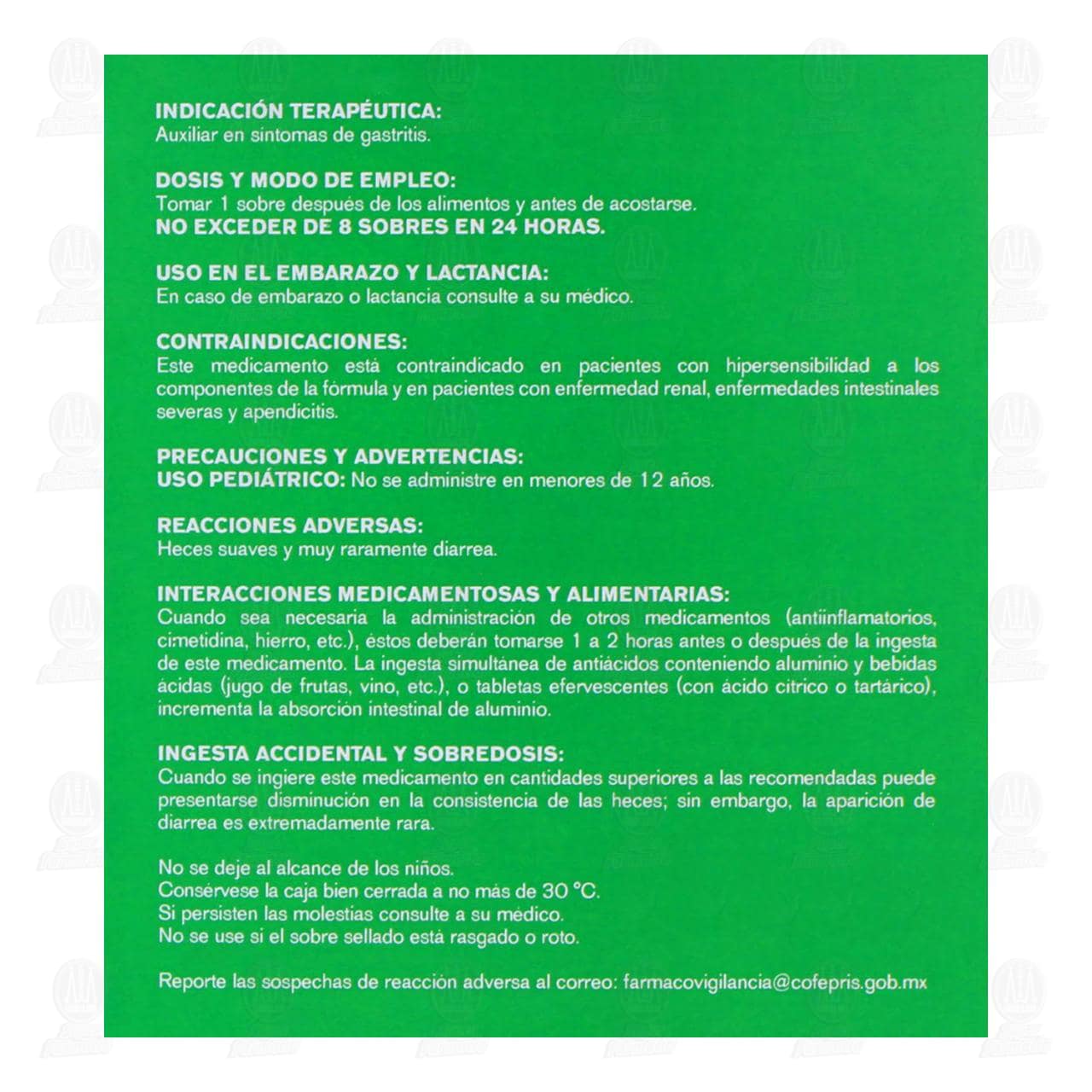 Vía de administración: Oral. Dosis y modo de empleo: Tomar 1 sobre después de los alimentos y antes de acostarse. No exceder de 8 sobres en 24 horas. Agítese antes de usarse.Detalles del producto