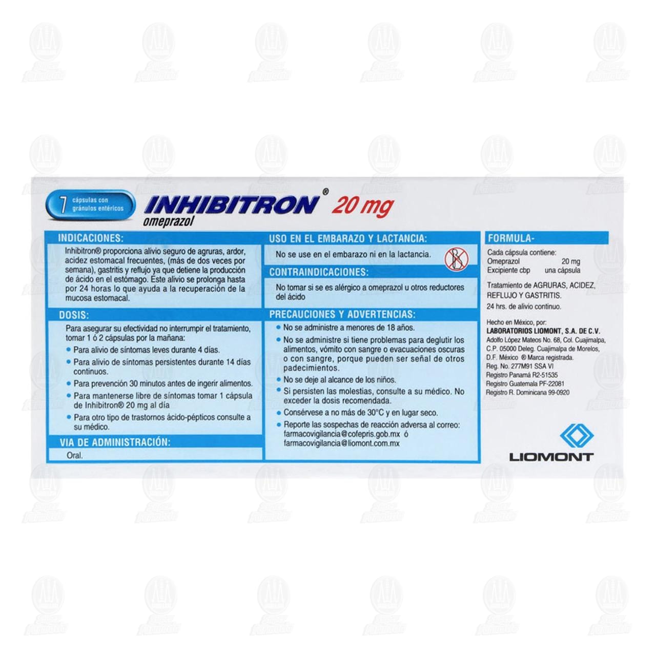 Efectos en la secreción de ácido gástrico: INHIBITRON® por vía oral una vez al día proporciona una rápida y eficaz inhibición de la secreción de ácido durante el día y la noche, logrando su máximo efecto dentro de cuatro días de tratamiento. INHIBITRON® 20 mg, en pacientes con úlcera duodenal, mantiene una disminución promedio de al menos 80% de la acidez intragástrica en un periodo de 24 horas, con una reducción promedio de la producción pico de ácido después de la estimulación con pentagastrina de aproximadamente el 70% después de 24 horas de la administración de la dosis mencionada.