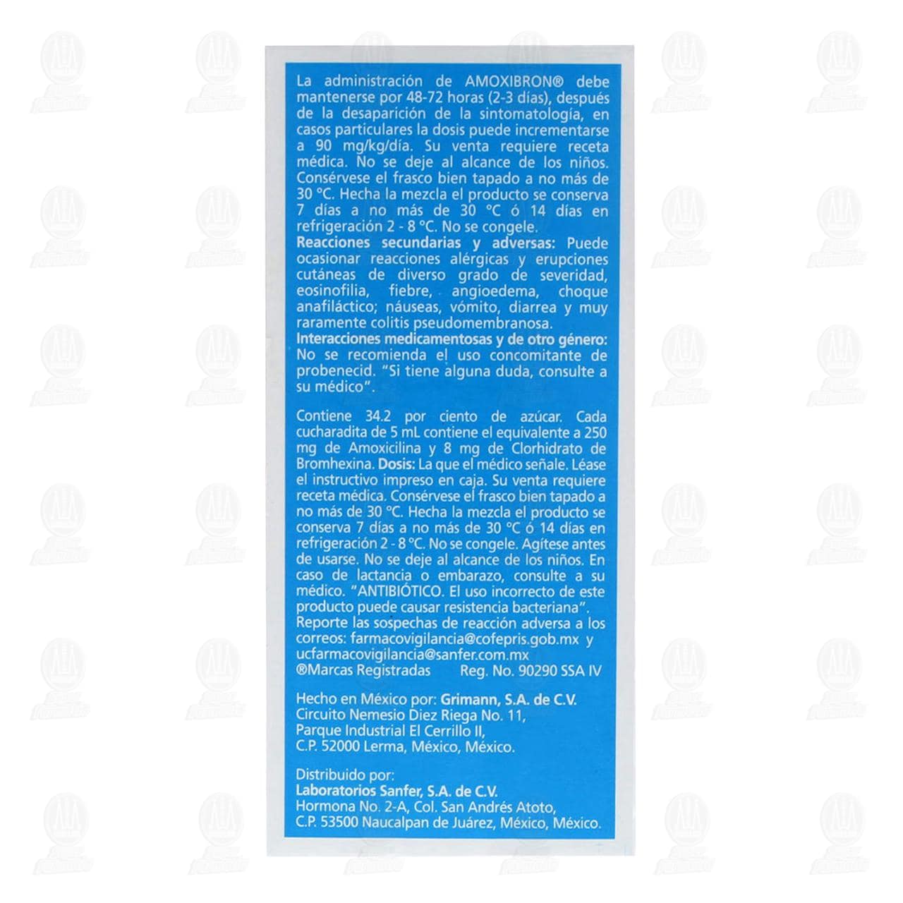 Su venta requiere receta médica. No se deje al alcance de los niños. No deberá usar AMOXIBRON® en menores de 5 años o consulte a su médico. Literatura exclusiva para médicos. No se administre este medicamento sin leer instructivo impreso en la caja. ANTIBIÓTICO: El uso incorrecto de este producto puede causar resistencia bacteriana.