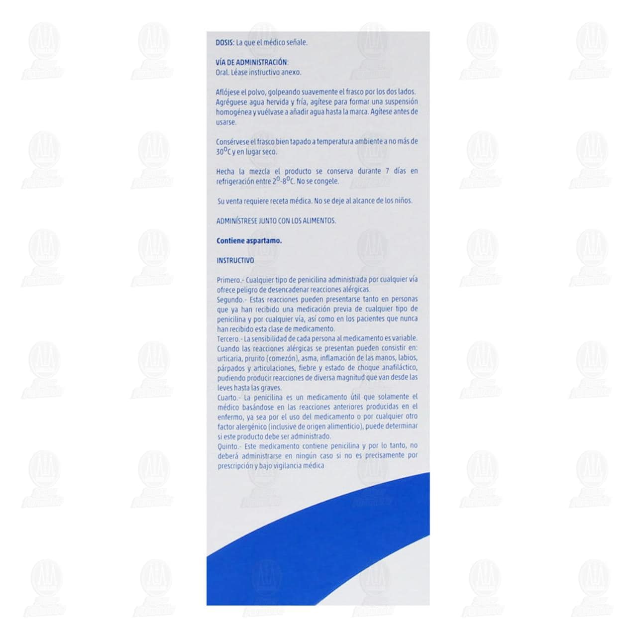 Vía de administración oral. Dosis, la que el médico señale. Léase instructivo anexo. Aflójese el polvo, golpeando suavemente el frasco por los dos lados. Agréguese agua hervida y fría, agítese para formar una suspensión homogénea y vuélvase a añadir agua hasta la marca. Agítese antes de usarse. Instructivo. 1. Cualquier tipo de penicilina administrada por cualquier vía ofrece peligro de desencadenar reacciones alérgicas. 2. Estas reacciones pueden presentarse tanto en personas que ya han recibido una medicación previa de cualquier tipo de penicilina y por cualquier vía, así como en los pacientes que nunca han recibido esta clase de medicamento. 3. La sensibilidad de cada persona al medicamento es variable. Cuando las reacciones alérgicas se presentan pueden consistir en: urticaria, prurito (comezón), asma, inflamación de las manos, labios, párpados y articulaciones, fiebre y estado de choque anafiláctico, pudiendo producir reacciones de diversa magnitud que van desde las leves hasta las graves. 4. La penicilina es un medicamento útil que solamente el médico basándose en las reacciones anteriores producidas en el enfermo, ya sea por el uso del medicamento o por cualquier otro factor alergénico (inclusive de origen alimenticio), puede determinar si este producto debe ser administrado. 5. Este medicamento contiene penicilina y por lo tanto, no deberá administrarse en ningún caso si no es precisamente por prescripción y bajo vigilancia médica.