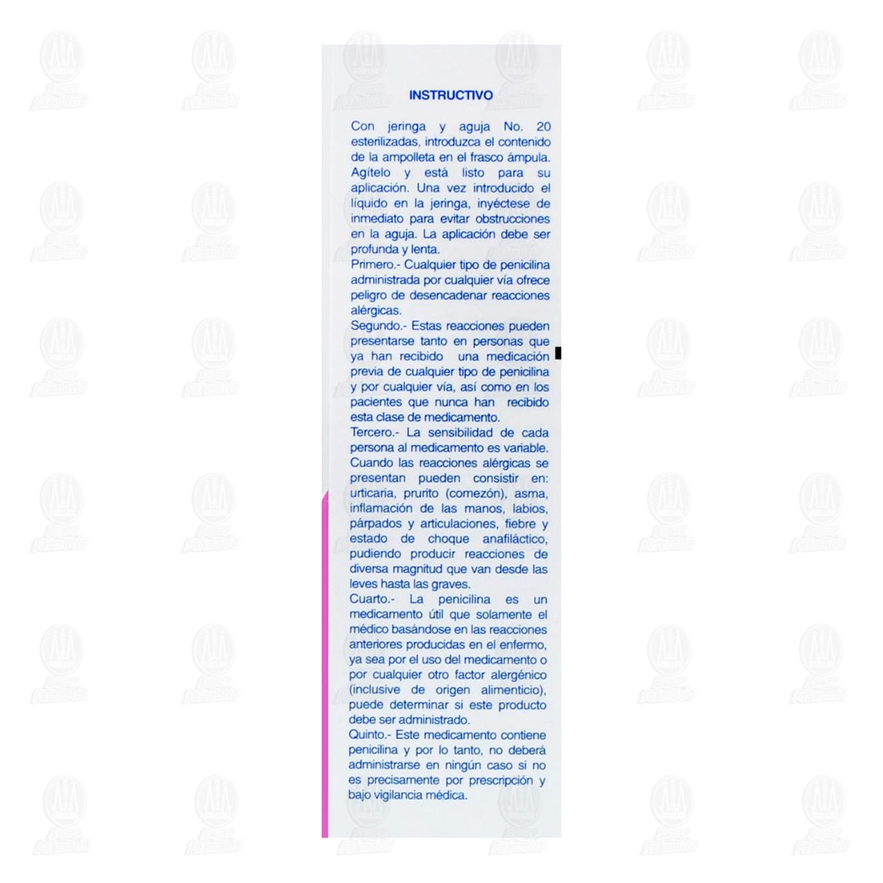 Vía de administración intramuscular. Dosis: la que el médico señale. Léase instructivo anexo. Agítese antes de usarse. Con jeringa y aguja No. 20 esterilizadas, introduzca el contenido de la ampolleta en el frasco ámpula. Agítelo y está listo para su aplicación. Una vez introducido el líquido en la jeringa, inyéctese de inmediato para evitar obstrucciones en la aguja. La aplicación debe ser profunda y lenta. Instructivo. 1. Cualquier tipo de penicilina administrada por cualquier vía ofrece peligro de desencadenar reacciones alérgicas. 2. Estas reacciones pueden presentarse tanto en personas que ya han recibido una medicación previa de cualquier tipo de penicilina y por cualquier vía, así como en los pacientes que nunca han recibido esta clase de medicamento. 3. La sensibilidad de cada persona al medicamento es variable. Cuando las reacciones alérgicas se presentan pueden consistir en: urticaria, prurito (comezón), asma, inflamación de las manos, labios, párpados y articulaciones, fiebre y estado de choque anafiláctico, pudiendo producir reacciones de diversa magnitud que van desde las leves hasta las graves. 4. La penicilina es un medicamento útil que solamente el médico basándose en las reacciones anteriores producidas en el enfermo, ya sea por el uso del medicamento o por cualquier otro factor alergénico (inclusive de origen alimenticio), puede determinar si este producto debe ser administrado. 5. Este medicamento contiene penicilina y por lo tanto, no deberá administrarse en ningún caso si no es precisamente por prescripción y bajo vigilancia médica.