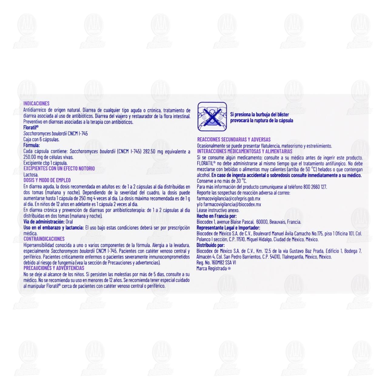 Contraindicaciones: Hipersensibilidad conocida a uno o varios componentes de la fórmula. Alergia a la levadura, especialmente Saccharomyces boulardii CNCM I-745. Pacientes con catéter venoso central y periférico. Pacientes críticamente enfermos o pacientes severamente inmunocomprometidos debido al riesgo de fungemia (vea la sección de precauciones y advertencias) No se deje al alcance de los niños. Si persisten las molestias por más de 5 días, consulte a su médico. No se recomienda su uso en menores de 12 años. Se recomienda tener especial cuidado al manipular Floratil cerca de pacientes con catéter venoso central o periférico. Reacciones secundarias y adversas: Ocasionalmente se puede presentar flatulencia, meteorismo y estreñimiento. Interacciones medicamentosas y alimentarias: Si se consume algún medicamento, consulte a su médico antes de ingerir este producto. Floratil no debe administrarse al mismo tiempo que el tratamiento antifúngico. No debe mezclarse con bebidas o alimentos muy calientes (arriba de 50°C) helados o que contengan alcohol. En caso de ingestión accidental o sobredosis consulte inmediatamente a su médico. Consérvese a no más de 30 °C. Reporte las sospechas de reacción adversa al correo: farmacovigilancia@cofepris.gob.mx. Léase instructivo anexo.Detalles del producto