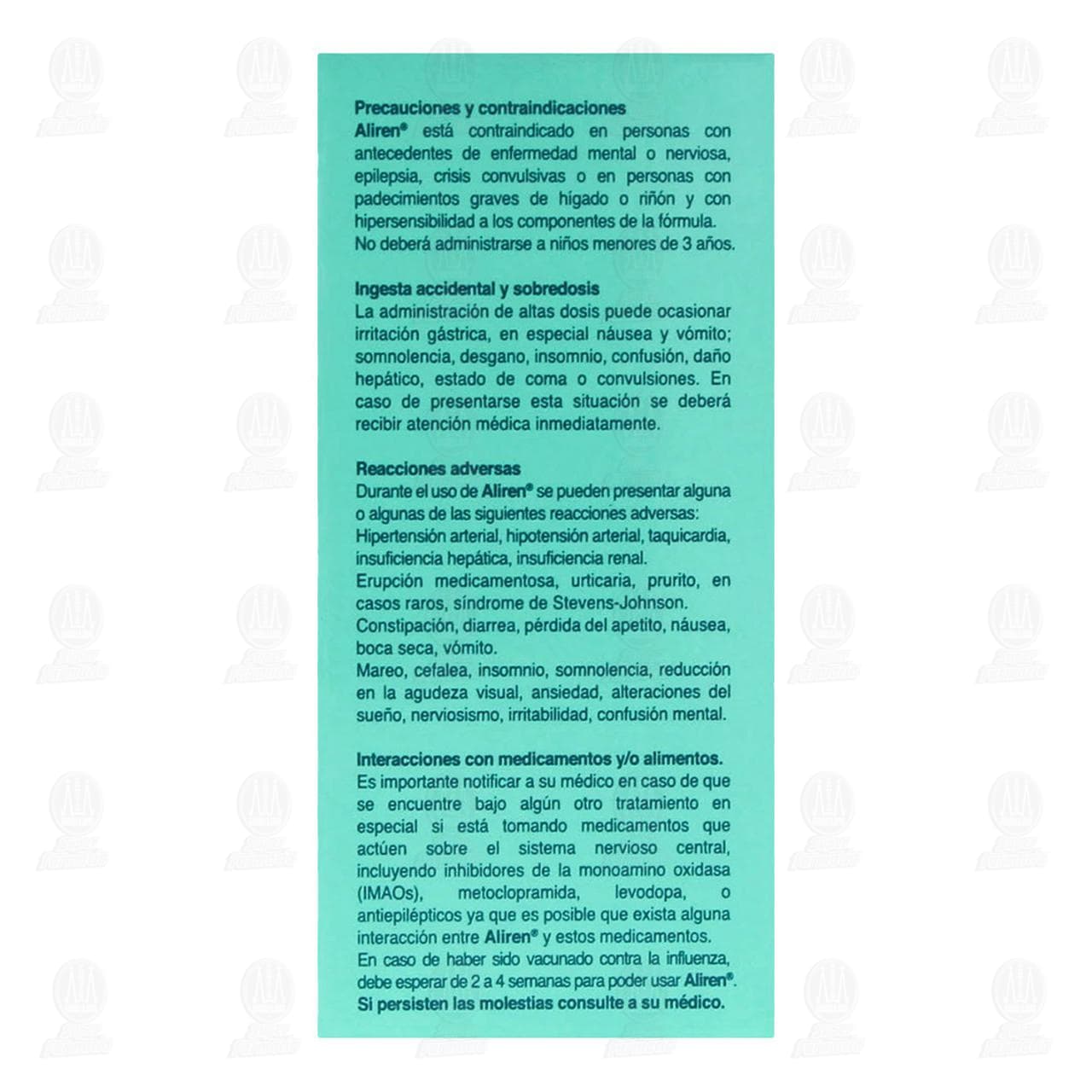 Indicación terapéutica: aliren está indicado en el tratamiento de la gripe. Actúa contra el virus que causa la enfermedad a la vez que alivia los síntomas del resfriado común como fiebre, cuerpo cortado, estornudos y escurrimiento nasal. Dosis: niños de 3 a 5 años: 5 ml cada 8 horas, niños de 6 a 12 años: 10 ml cada 8 horas. Se recomienda iniciar la administración desde el inicio de los síntomas. Vía de administración: oral.Detalles del producto