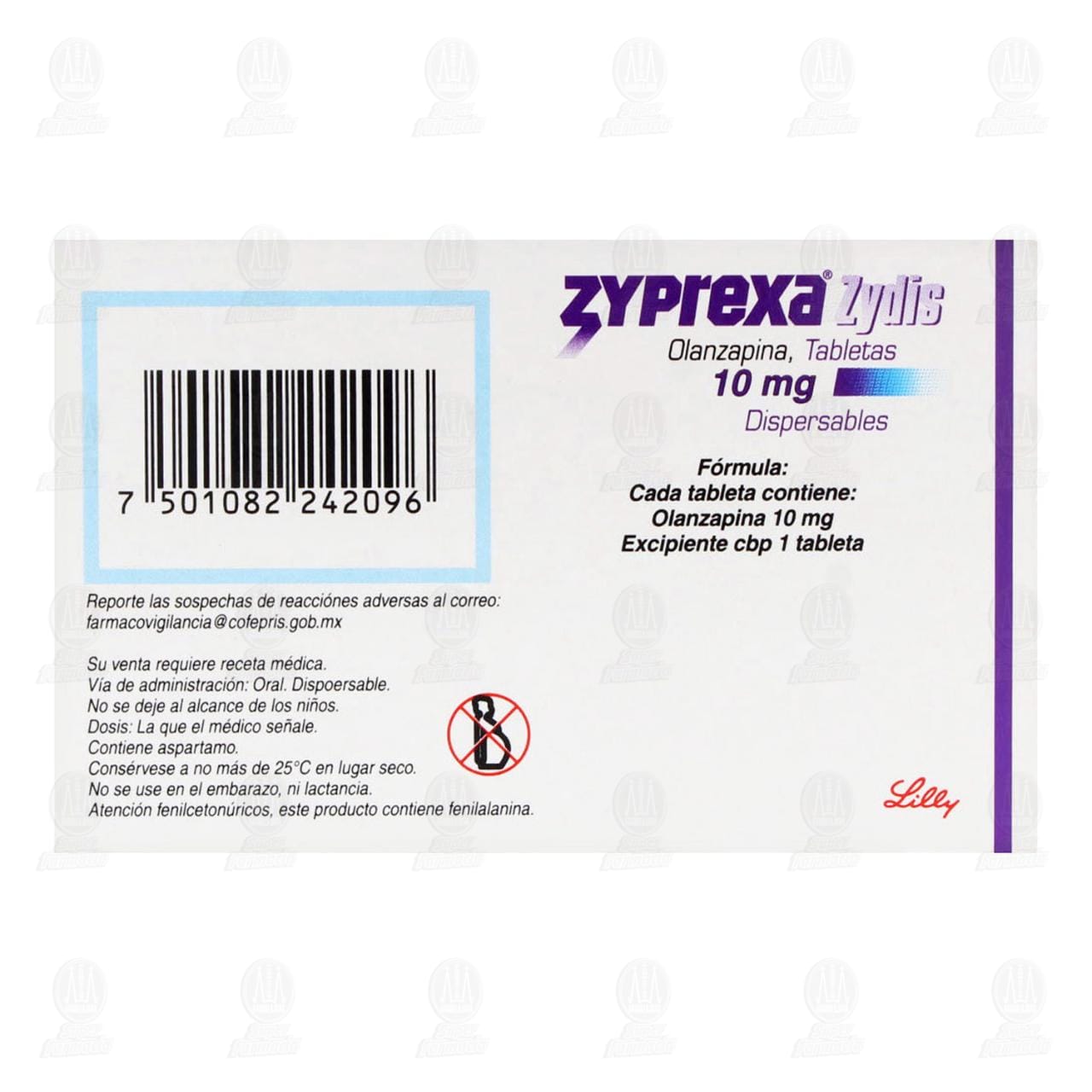 Descripción: Olanzapina es un agente antipsicótico. ZYPREXA* se presenta en tabletas recubiertas, para administración oral de 5 y 10 mg impresas con el nombre Lilly y un número de identificación. ZYPREXA ZYDIS* se presenta en tabletas de rápida desintegración (tabletas dispersables). Cada tableta dispersable para administración oral contiene 5 y 10 mg.
