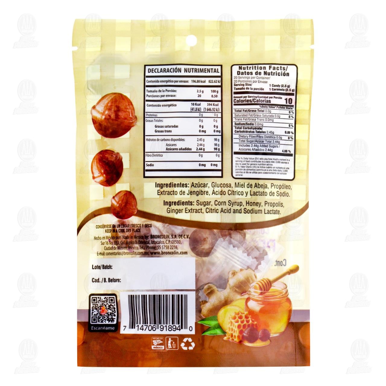 Caramelos Broncolin Properlas concentradas con miel, propóleo y jengibre que ayudan a suavizar la garganta. Contiene 50 gramos.