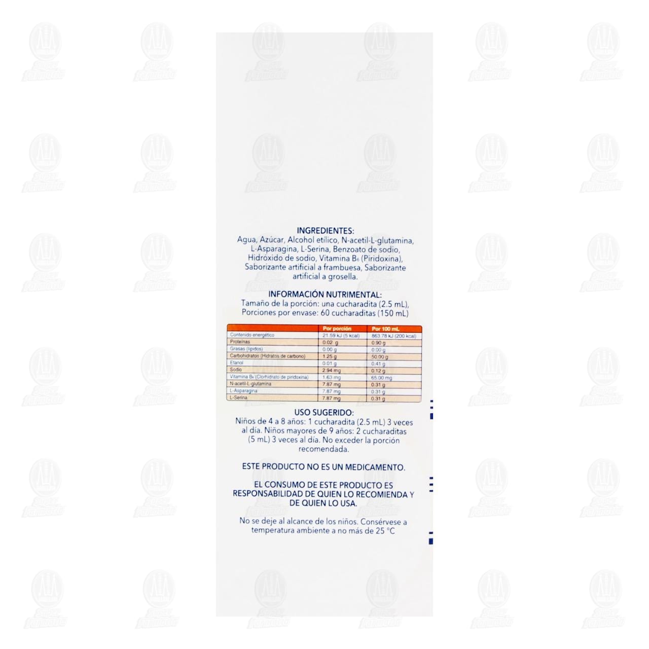 INGREDIENTES: Agua, azúcar, alcohol etílico, n-acetil-l-glutamina, L-asparagina, L-serina, benzoato de sodio, hidróxido de sodio, vitamina B6 (piridoxina), saborizante artificial a frambuesa, saborizante artificial a grosella.