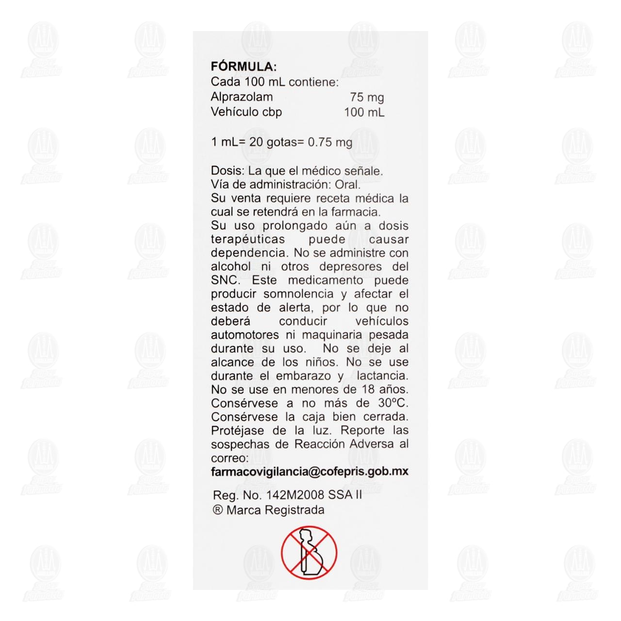 La concentración de Alprazolam gotas es de 0.75 mg/ml. Cada ml equivale a 20 gotas.