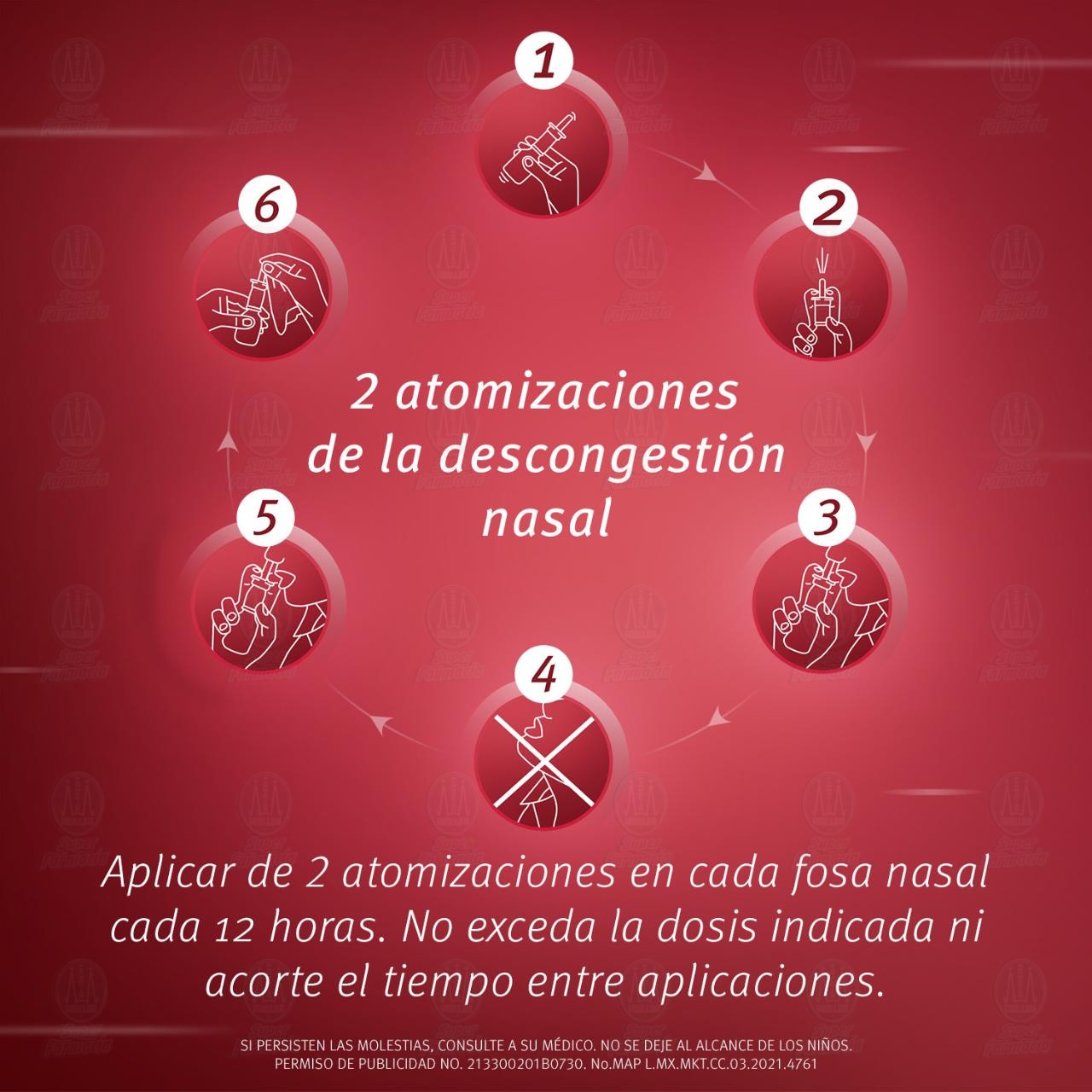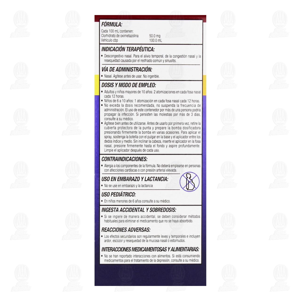 Vía de administración: Nasal. Agitase antes de usar. No ingerible. Dosis y modo de empleo: Adultos y niños mayores de 12 años: 2 atomizaciones en cada fosa nasal cada 12 horas. Niños de 6 a 10 años: 1 atomización en cada fosa nasal cada 12 horas.Detalles del producto