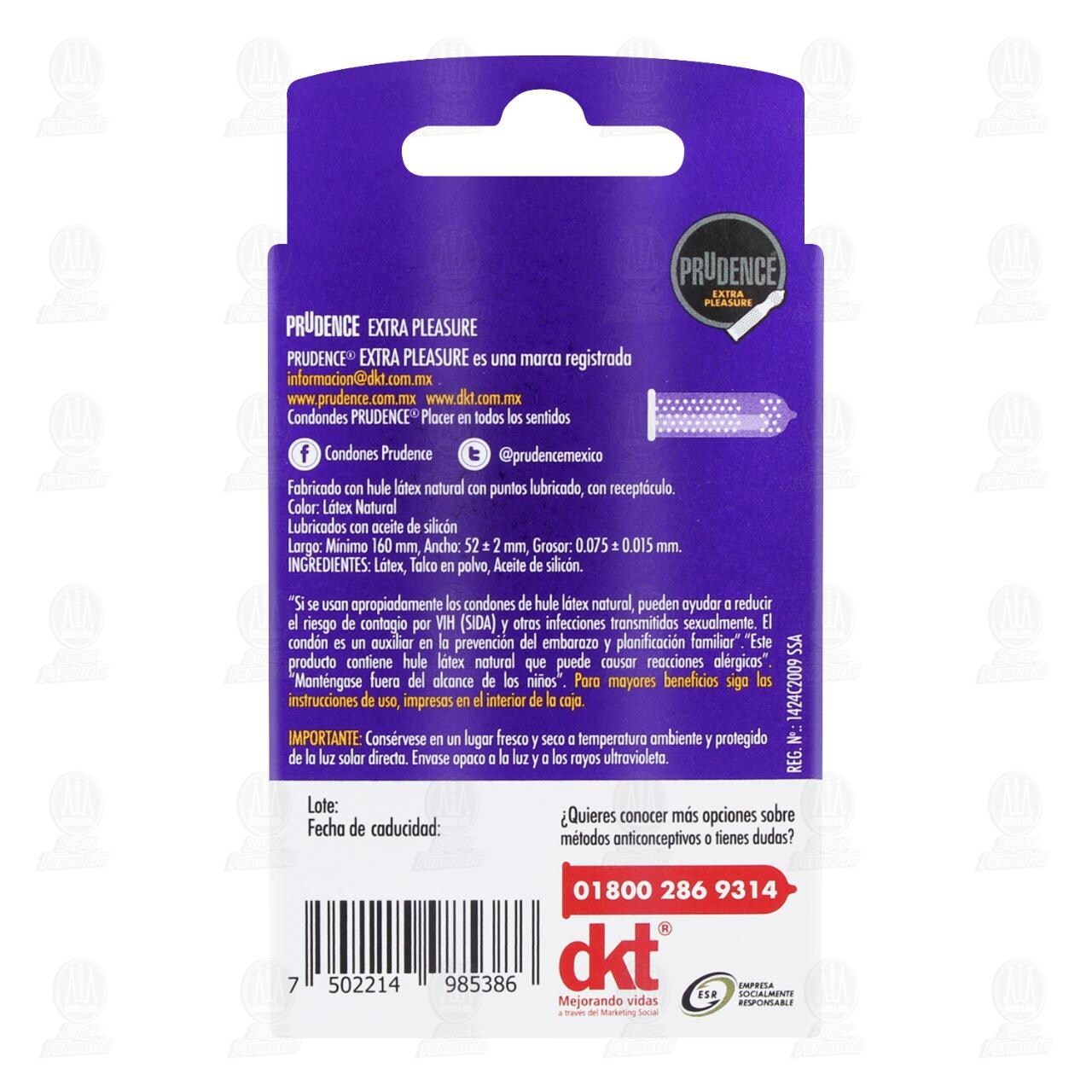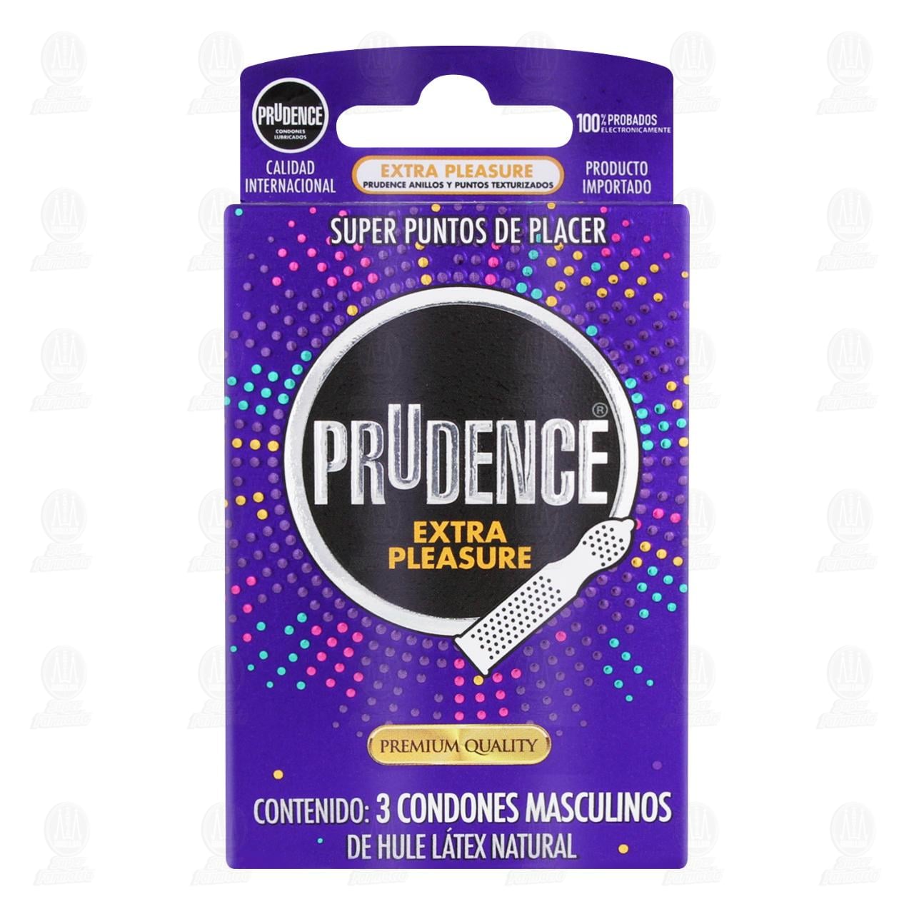 Condones masculinos Prudence de hule látex natural Extra Pleasure, Súper puntos de placer premium quality. Contiene 3 condones.