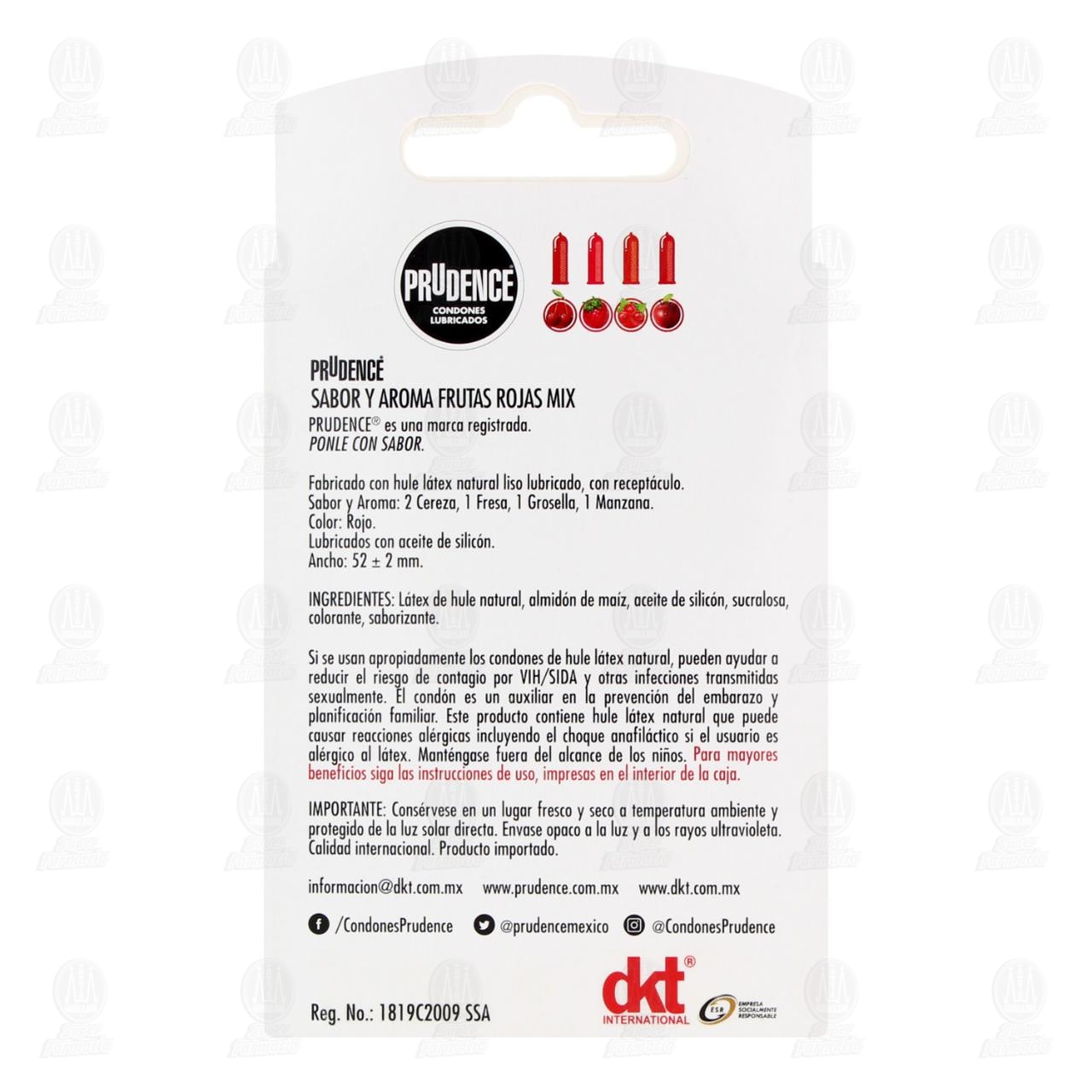 Prudence condones lubricados masculinos sabor y aroma frutas rojas mix (cereza, fresa, grosella y manzana). Contiene 5 condones.