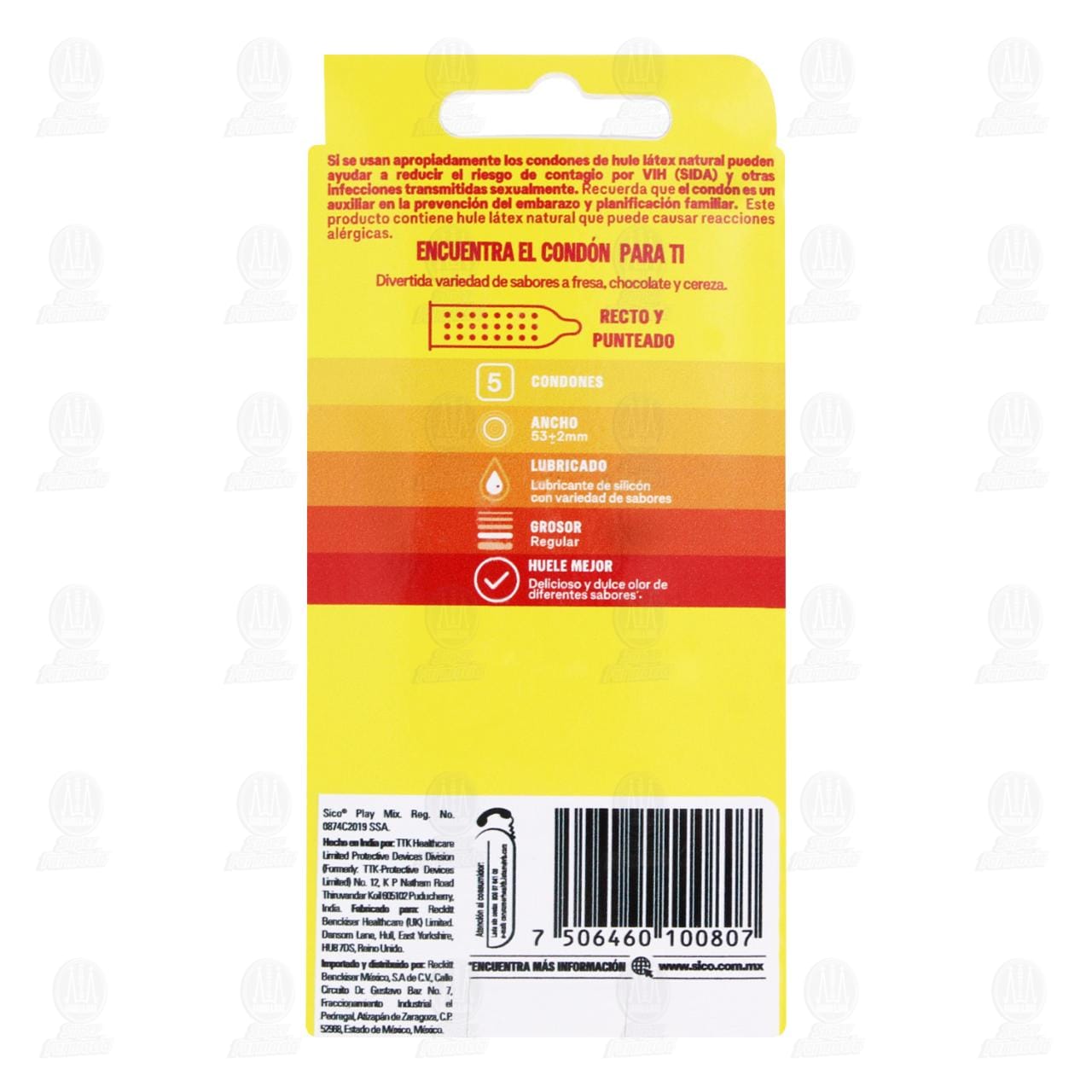 Condones Sico Play de hule látex natural mix doble diversión, Sabor 2 en 1 texturizado (Sabor fresa, chocolate y cereza). Contiene 5 condones.
