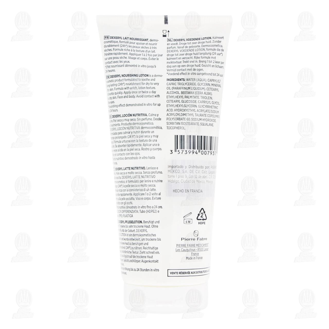 Dexeryl Loción Nutritiva formulado para calmar y nutrir durante un tiempo prolongado (24h) la piel seca y muy seca de cuerpo y rostro. Contiene 200 mililitros.