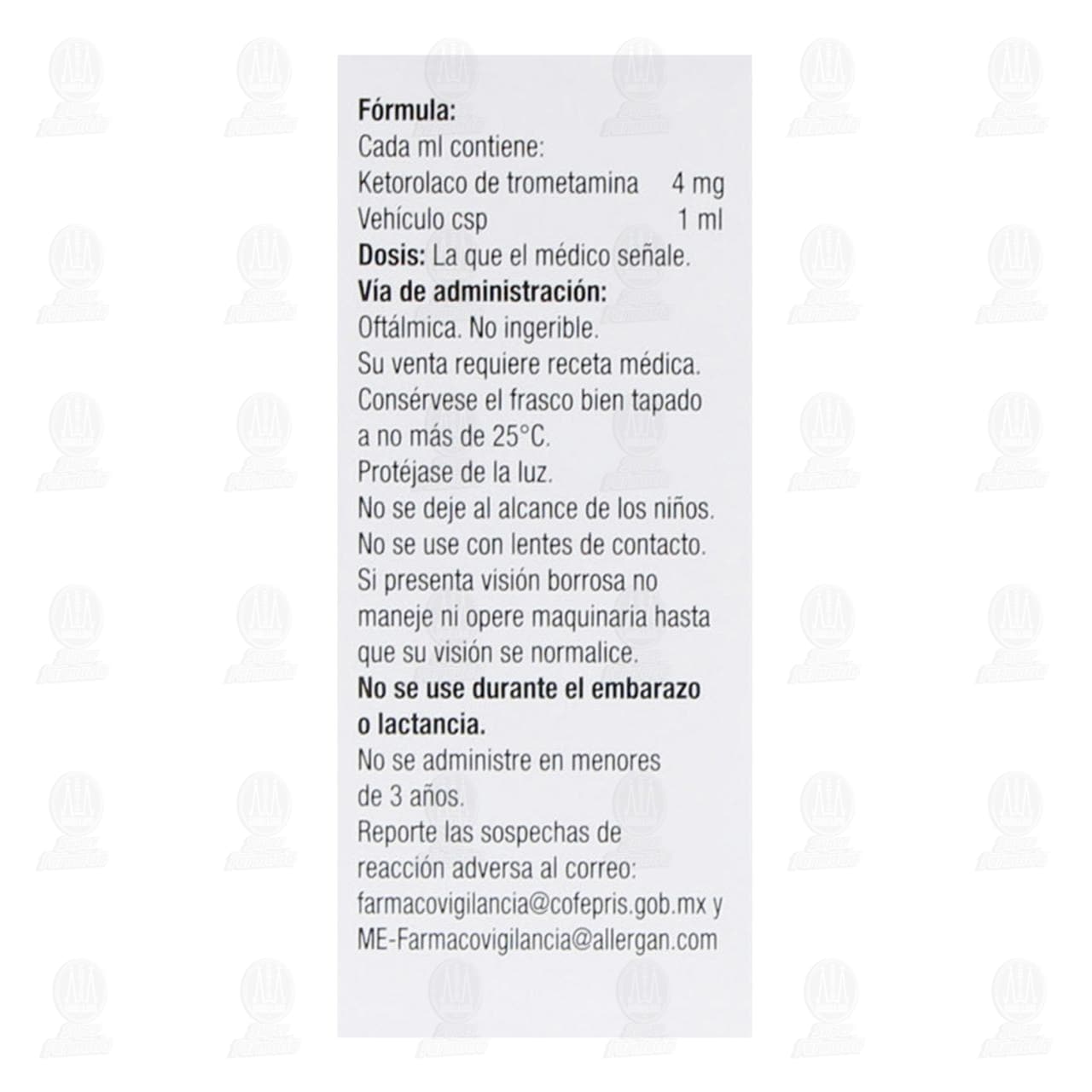 Dos gotas (0.1 ml) de solución oftálmica de ketorolaco de trometamina al 0.5% instiladas en los ojos de pacientes 12 horas y 1 hora antes de la extracción de catarata alcanzó niveles medibles en los ojos de 8 de 9 pacientes (concentración promedio de ketorolaco 95 ng/ml en el humor acuoso, rango 40 a 170 ng/ml). La administración ocular del ketorolaco de trometamina reduce los niveles de la prostaglandina E2 (PGE2) en el humor acuoso. La concentración promedio de PGE2 fue de 80 pg/ml en el humor acuoso de los ojos que recibieron vehículo y 28 pg/ml en los ojos que recibieron solución oftálmica de ketorolaco de trometamina al 0.5%.