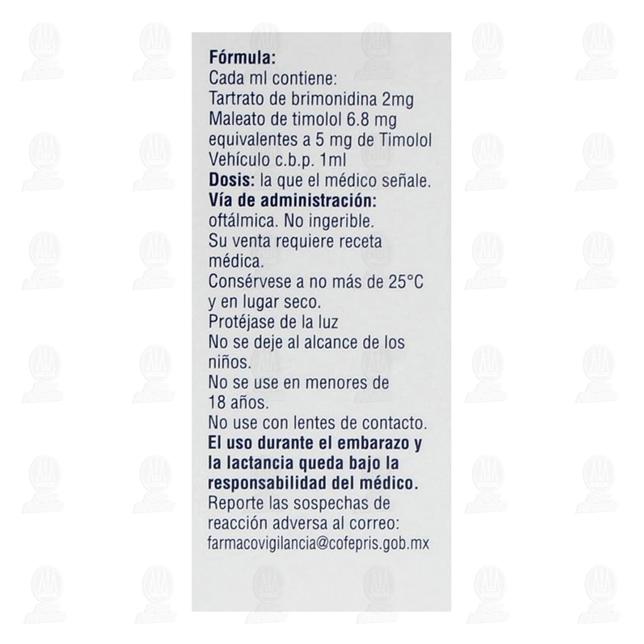 Tanto la brimonidina como el timolol tienen un rápido inicio de acción, con un efecto máximo de hipotensión ocular visto a las 2 horas después de administrar brimonidina y de una a dos horas para timolol. La reducción significante de la presión intraocular puede ser mantenida por periodos de hasta 12 horas para brimonidina y de 24 horas para una dosis simple de timolol.