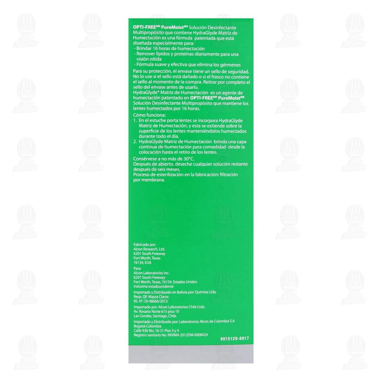 - Opti Free Pure Moist solución desinfectante multipropósito contiene hydraglyde matrix de humectación es una fórmula patentada que está diseñada especialmente para: brindar 16 horas de humectación. Remover lípidos y proteínas diariamente para una visión nítida. Fórmula suave y efectiva que elimina los gérmenes.