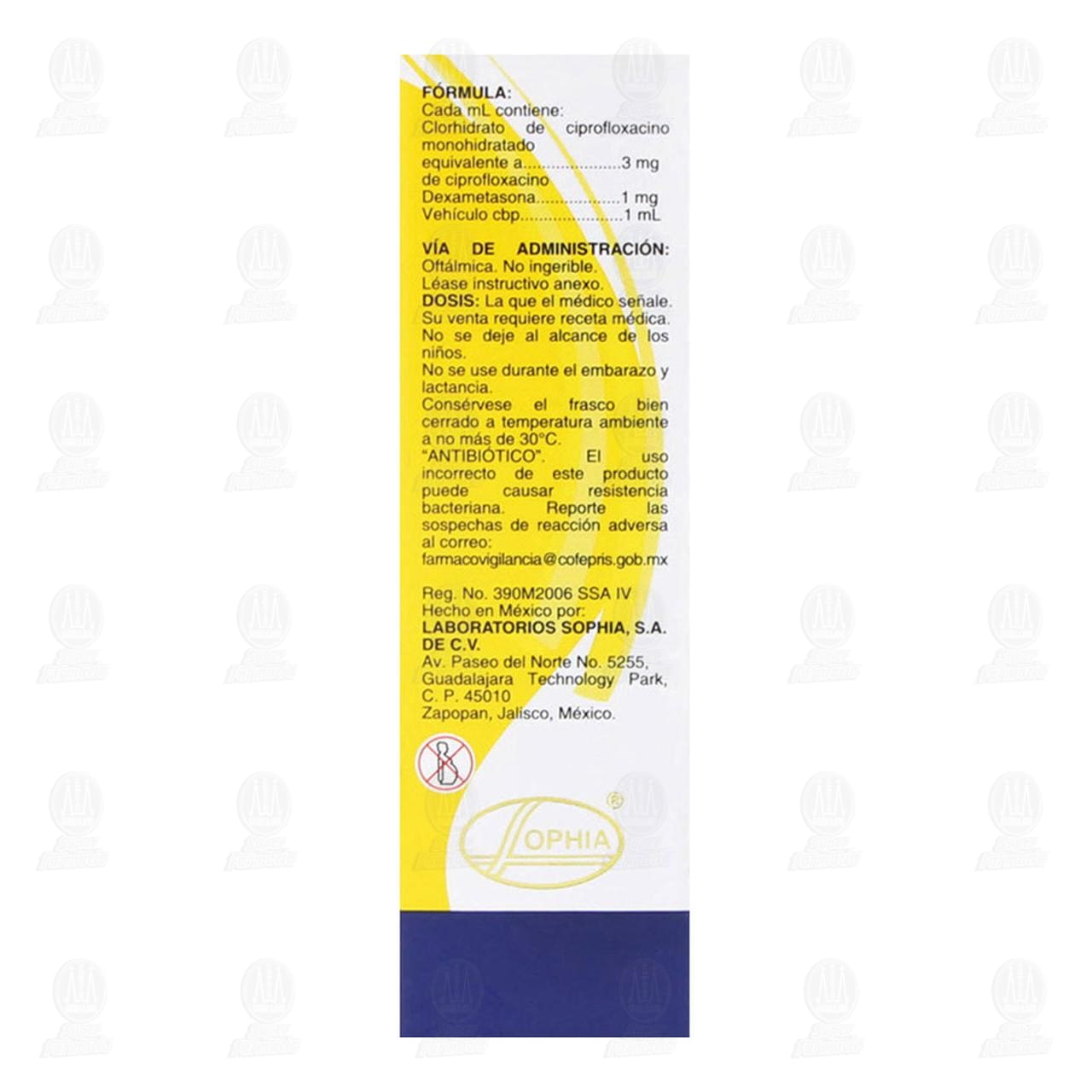 PRECAUCIONES EN RELACIÓN CON EFECTOS DE CARCINOGÉNESIS, MUTAGÉNESIS, TERATOGÉNESIS Y SOBRE LA FERTILIDAD: No se han realizado estudios controlados en mujeres embarazadas con SOPHIXIN DX OFTENO®, sin embargo, se han llevado a cabo estudios de reproducción en ratas y ratones con hasta seis veces la dosis habitual de la dosificación humana por vía oral de ciprofloxacino sin que haya revelado evidencia de daño a la fertilidad o lesión fetal. Pruebas in vitro de mutagenicidad han evidenciado resultados negativos. Los estudios de carcinogenicidad de largo plazo en ratones y ratas han sido complementados y no existe evidencia de que el ciprofloxacino tenga algún efecto carcinogénico o mutagénico en esas especies animales. La administración de ciprofloxacino en conejos en dosis orales de 30 a 100 mg/kg produjo alteraciones gastrointestinales, desequilibrio hidroelectrolítico, pérdida de peso en las hembras y aumento en la incidencia de abortos. Sin embargo, no se observó efecto teratogénico alguno en ninguna de las conejas a las dosis descritas. La administración intravenosa de dosis hasta de 20 mg/kg no produjo toxicidad materna ni embriotoxicidad o teratogenicidad.