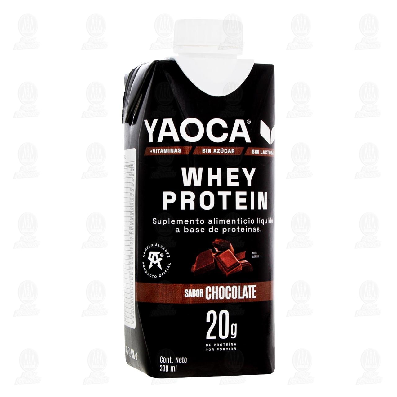 Suplemento Alimenticio Yaoca Whey Protein sabor chocolate líquido a base de proteínas, sin azúcar ni lactosa. Contiene 330 mililitros.