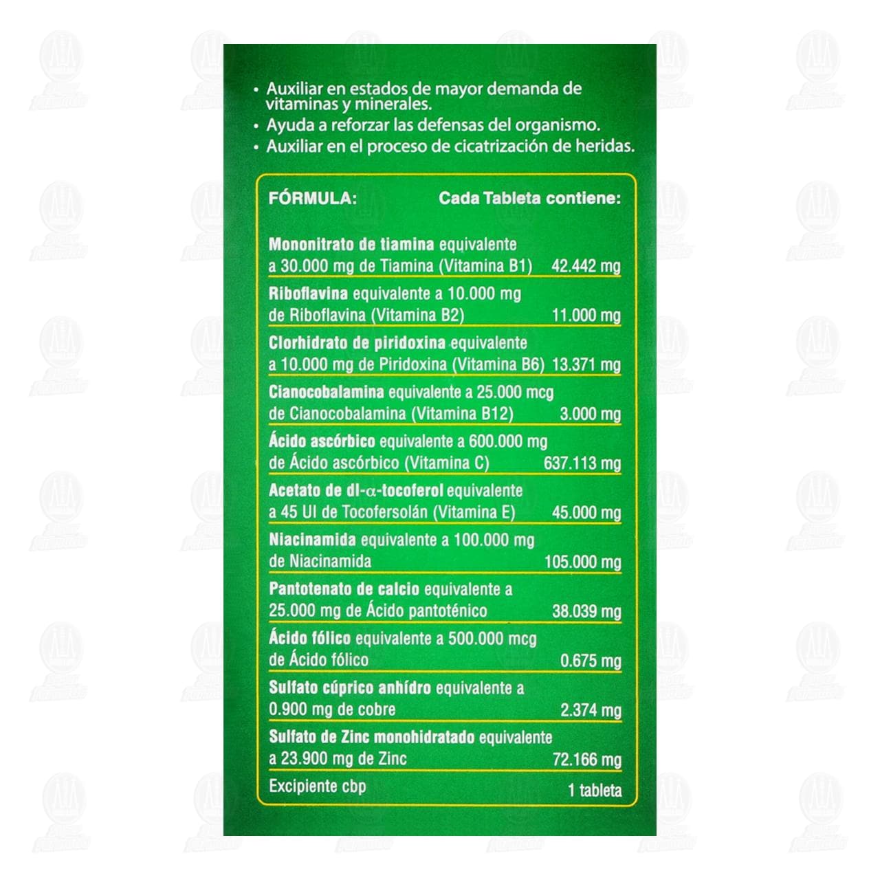 Contraindicaciones: No use Stresstabs + Zinc si usted tiene hipersensibilidad a cualquiera de los componentes de la fórmula. Reacciones adversas: el uso de Stresstabs + Zinc puede causar malestar abdominal, constipación, diarrea, náusea, malestar estomacal e hipersensibilidad a alguno de los componentes de la fórmula. Adminístrese de acuerdo a la dosis recomendada, la ingesta de grandes cantidades de este medicamento puede ocasionar hipervitaminosis. Si está tomando otro complemento, lea la etiqueta, ya que podría contener el mismo ingrediente. Uso en el embarazo y lactancia: en caso de embarazo o lactancia, consulte a su médico antes de usar. Uso pediátrico: no se recomienda su uso en niños. Consulte a su médico. Interacciones medicamentosas: si se encuentra bajo vigilancia médica o toma algún medicamento recetado por su médico consúltelo. Ingesta accidental y sobredosis: suspenda inmediatamente el medicamento y consulte a su médico. No se deje al alcance de los niños. Consérvese a no más de 30°C y en lugar seco. Protéjase de la luz. Contiene un desecante no ingerible, consérvese dentro del envase. Si persisten las molestias, consulte a su médico. No exceder la dosis diaria recomendada. Este medicamento contiene amarillo No. 6, que puede producir reacciones alérgicas. Reporte las sospechas de reacción adversa al correo: farmacovigilancia@cofepris.gob.mx y farmacovigilancia.mx@gsk.com.Detalles del producto