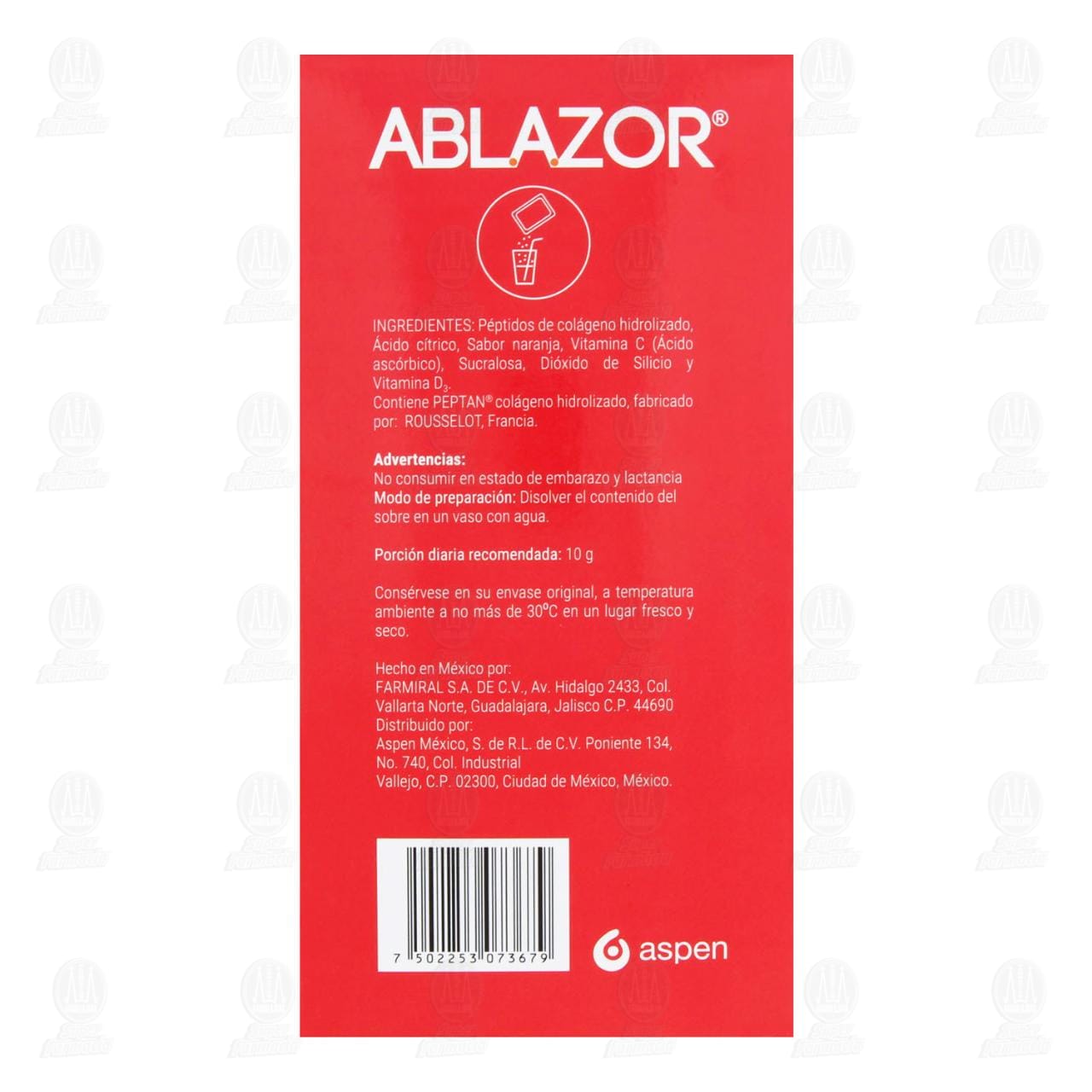 Suplemento alimenticio Ablazor con colágeno Peptan, en polvo para reconstituir, a base de péptidos de colágeno hidrolizado, sabor naranja. Caja con 300 gramos (30 sobre de 10 gramos cada uno).