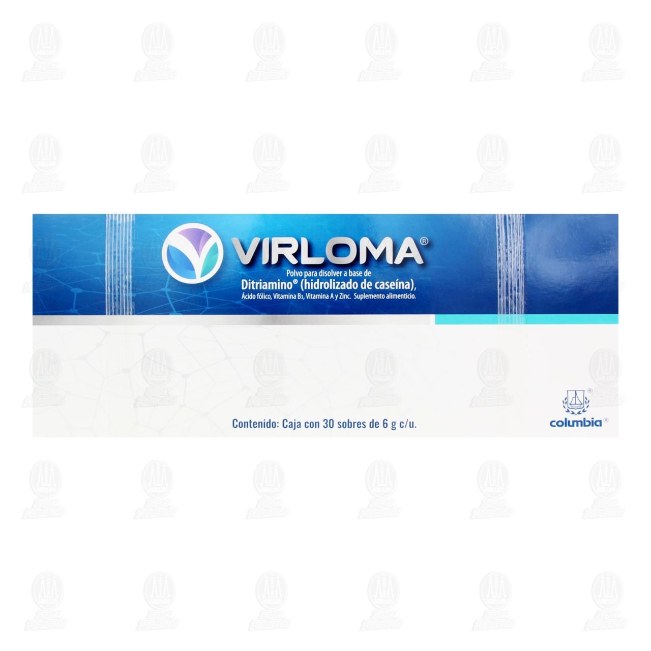 Suplemento Alimenticio Virloma Polvo para disolver, 30 Sobres de 6 gramos cada uno (A base de ditriamino hidrolizado de caseína, Ácido fólico, Vitamina B3, Vitamina A, Zinc)